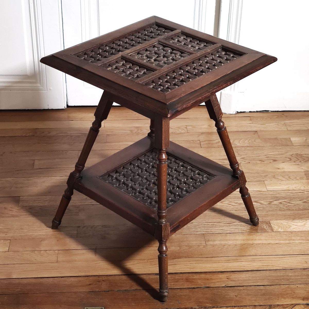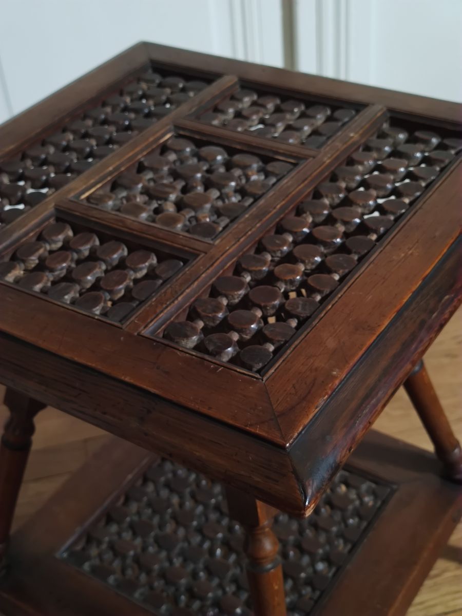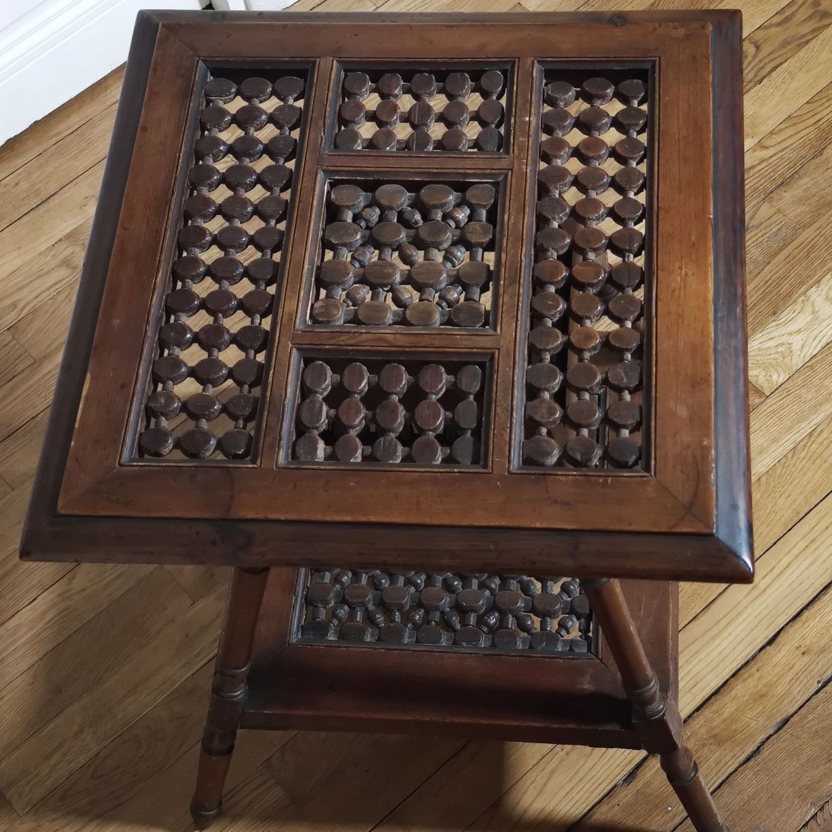 Pour les amateurs de décoration orientale, ce guéridon est fait pour vous. C'est un guéridon en bois naturel et bois tourné à décor moucharabieh. Piètement de forme pyramidale réuni par une tablette d'entrejambe. Travail syrien