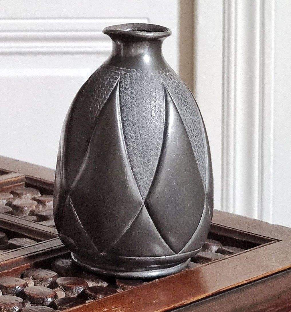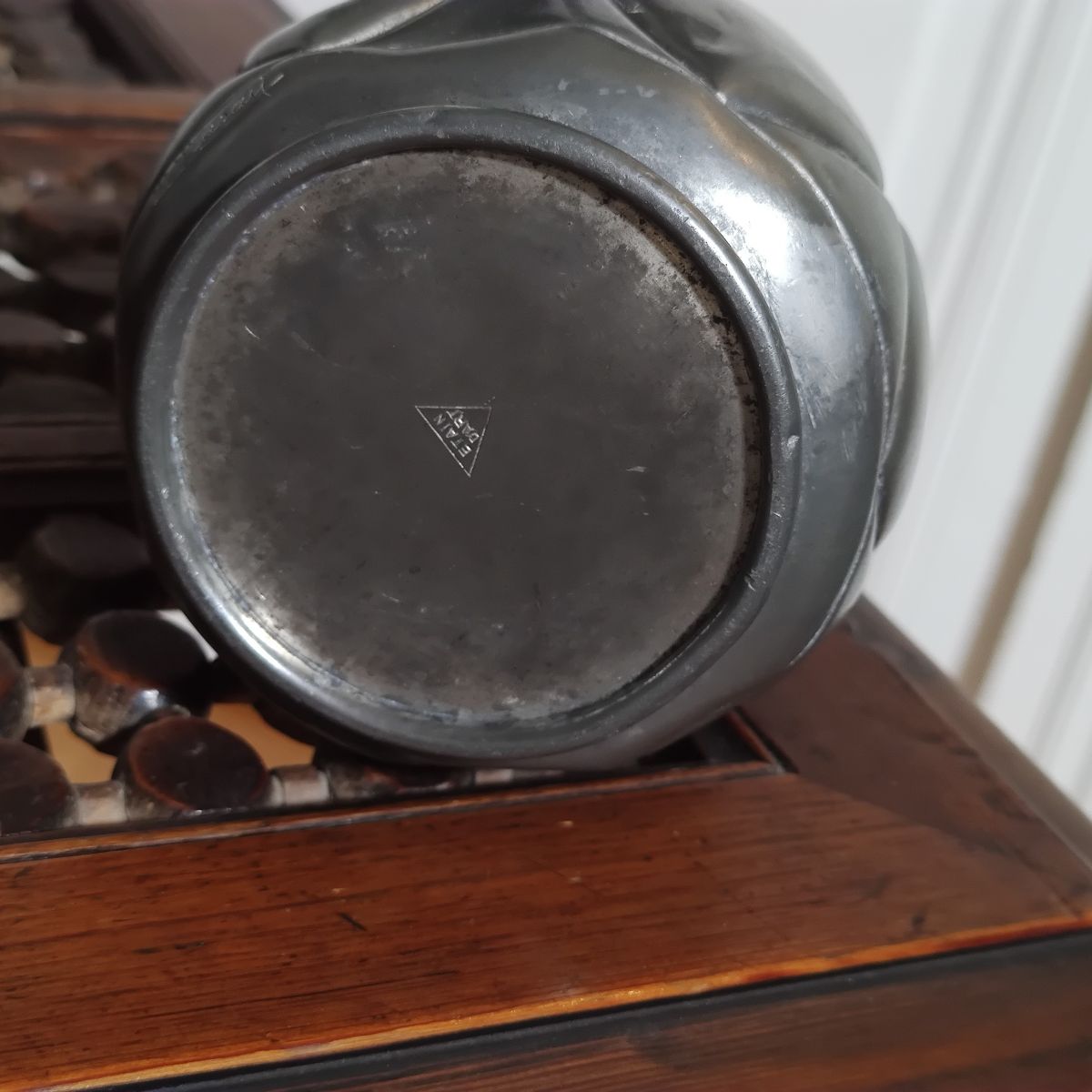 Joli petit vase étain d'art et signé par Pierre Amédée Plasait. Style art déco. Étain martelé et lisse. Belle patine.