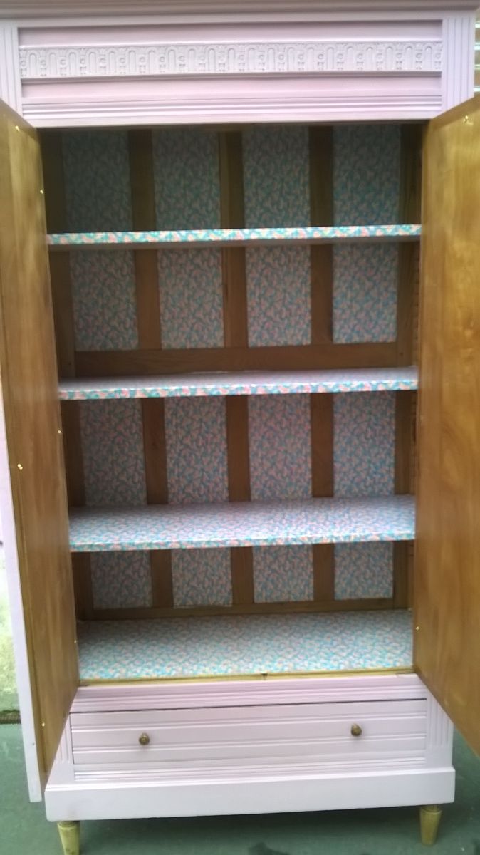 Armoire parisien art déco. Elle a été poncé et repeinte. Intérieur aménagé de 3 étagères. Et un tiroir sur le bas.