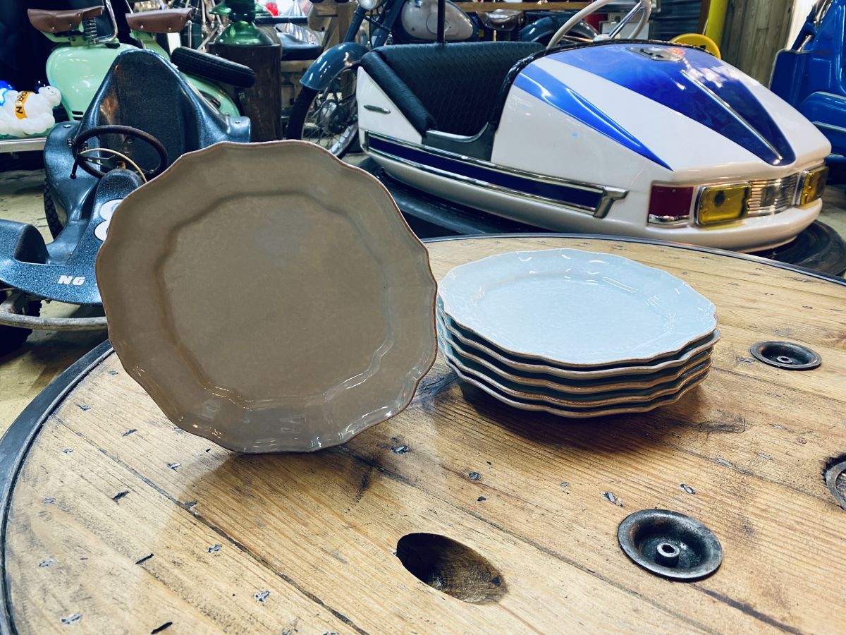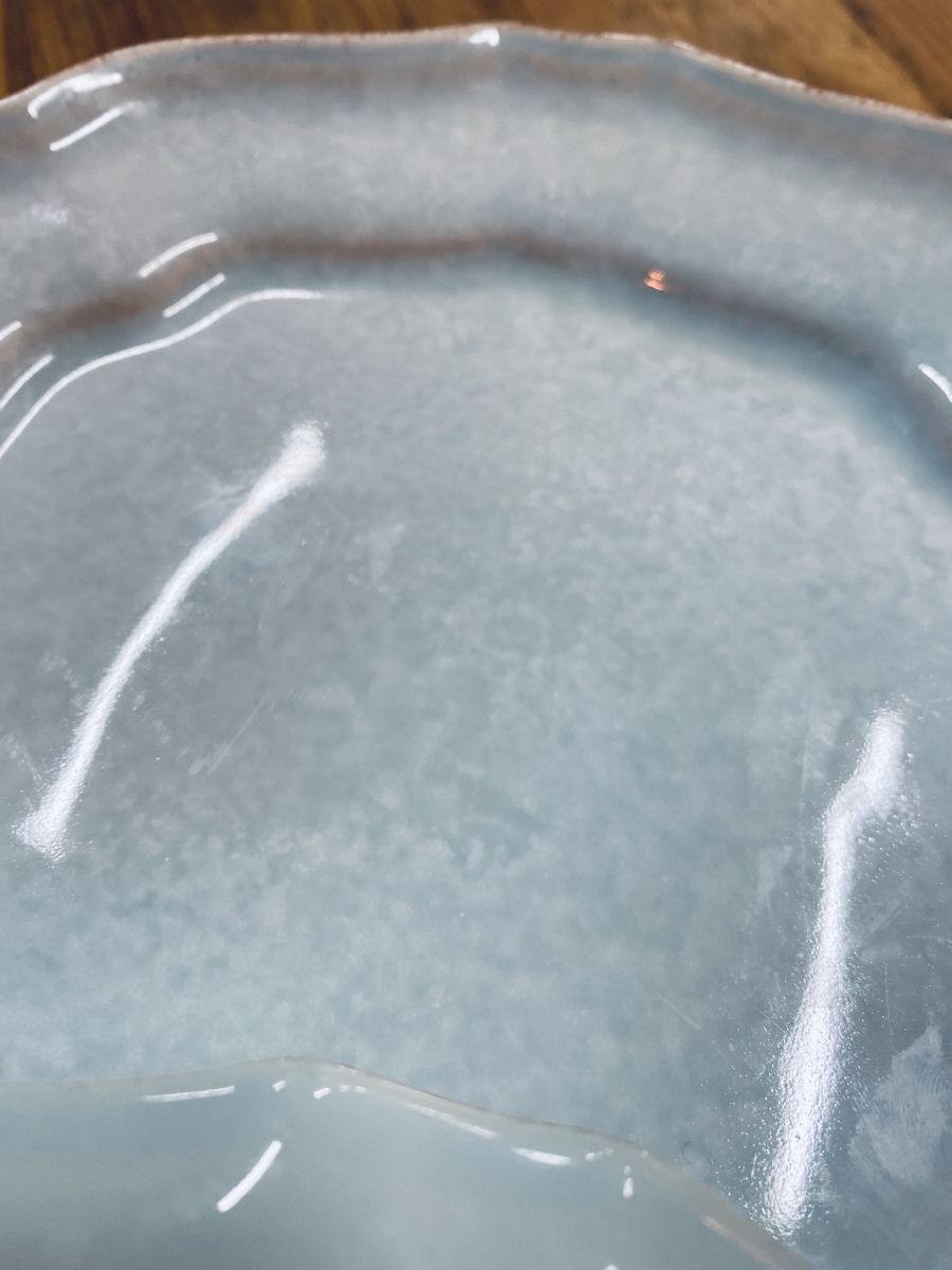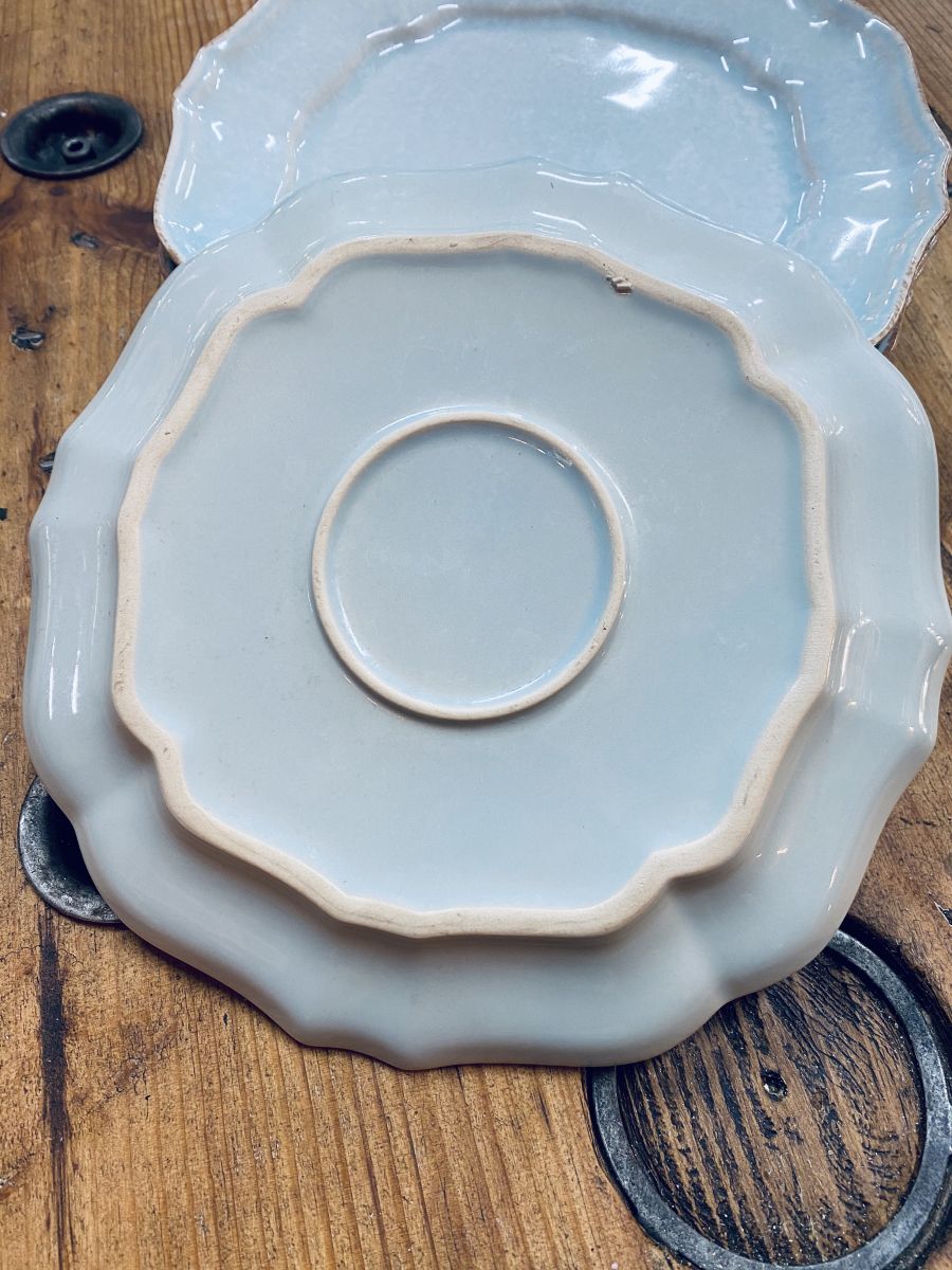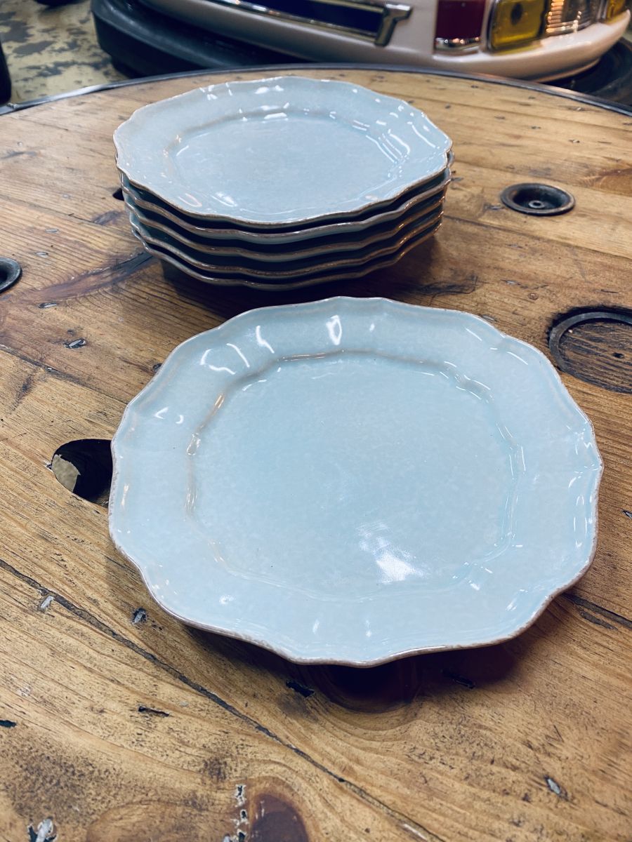 Lot de 6 assiettes à dessert en faïence. Excellent état, aucune fêlure ni cassure pour les 6 assiettes. Belle couleur bleu moucheté de blanc effet vert années 60.