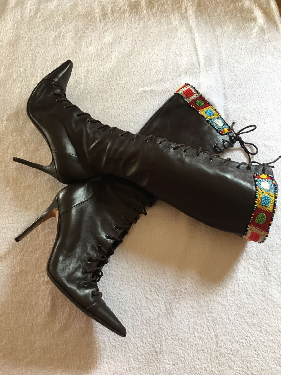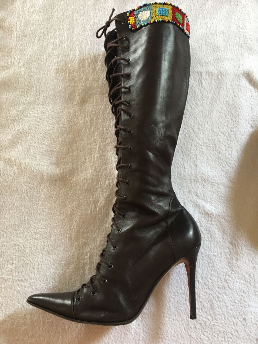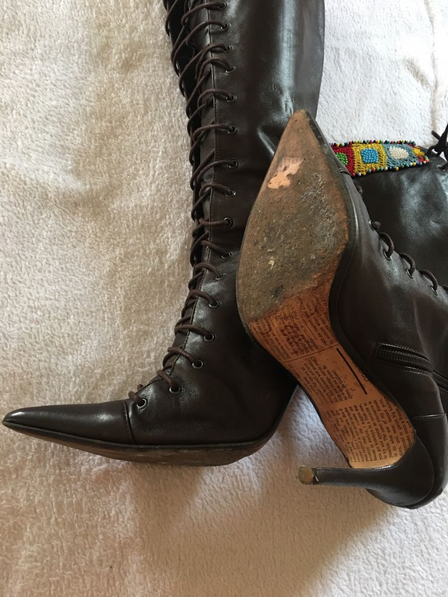 Bottes vintage John Galliano 100 % cuir couleur Marron elles sont en excellent état. La semelle est en cuir également c’est pour cela qu’elle est comme ça