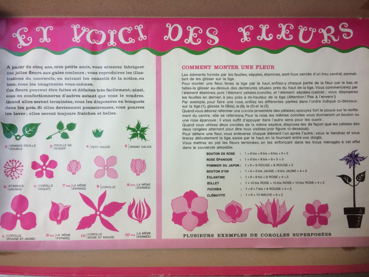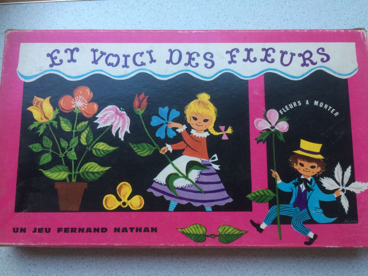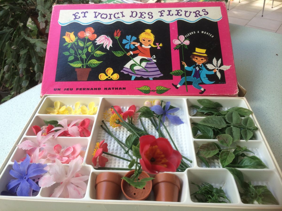 Et voici des Fleurs, jeu Fernand Nathan des années 60. Un jeu de fleurs à monter soi-même à partir de 5 ans. On enfile les éléments colorés (feuilles, sépales, étamines) sur une tige et on obtient facilement des roses, boutons d'or, églantines, œillets, fuchsias, ou clématites, qu'on peut planter dans des petits pots (fournis)