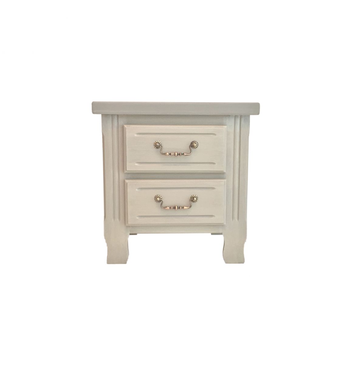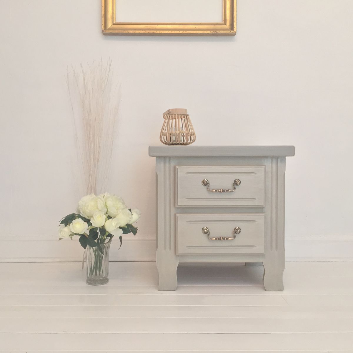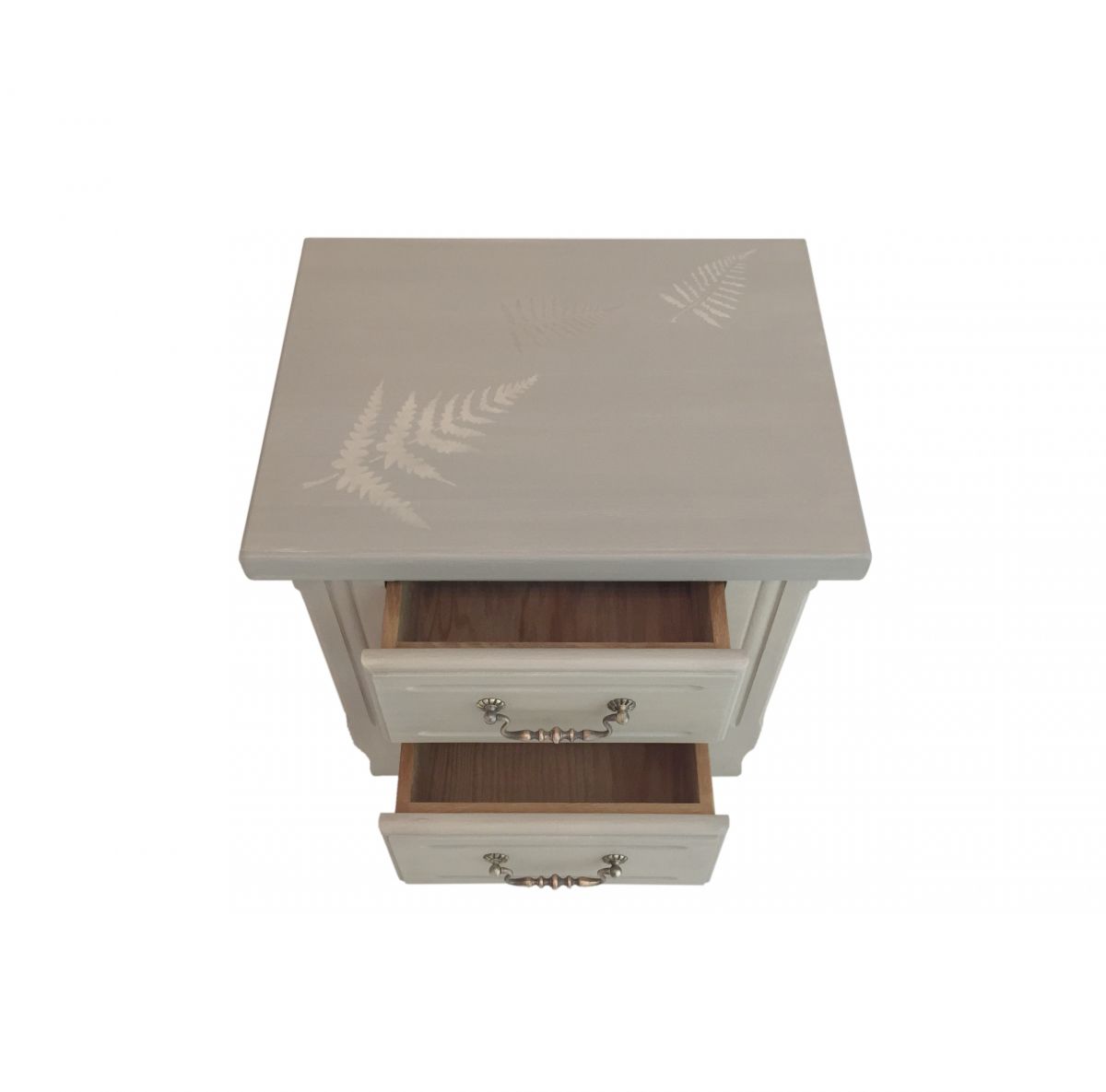 Une petite table de chevet mignonne, peinte en Country Grey, French Linen et Honfleur avec un émail nacré. Un subtil pochoir de fougère découpé à la main décore le dessus.