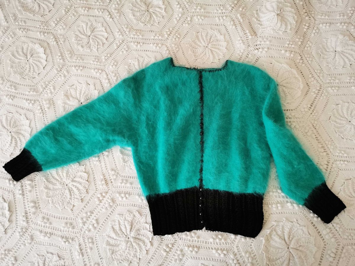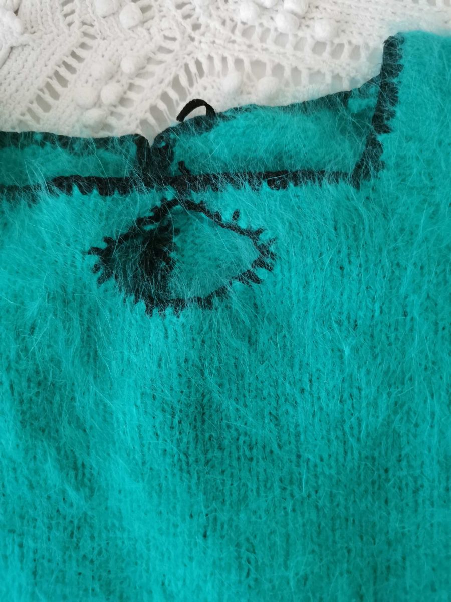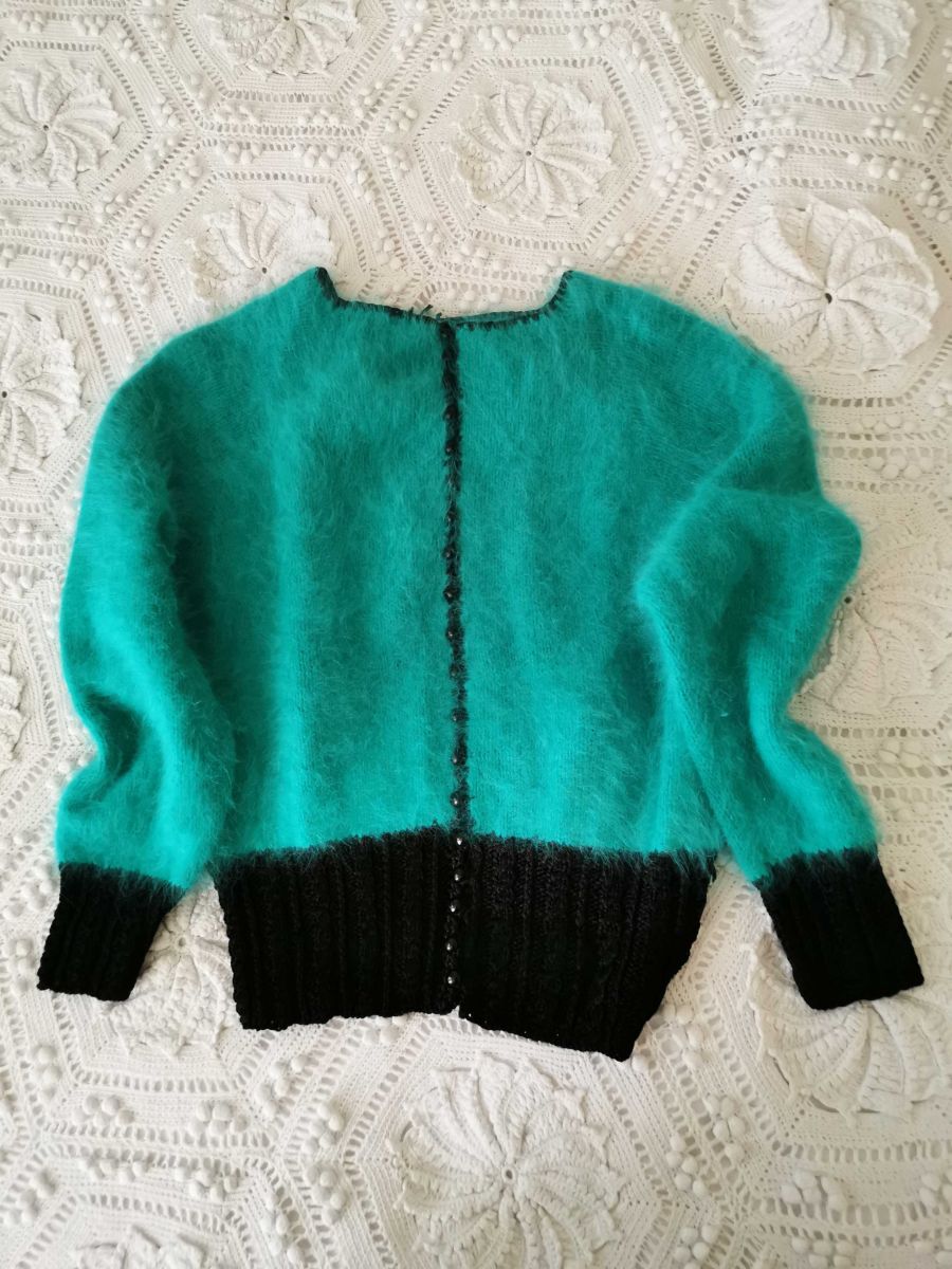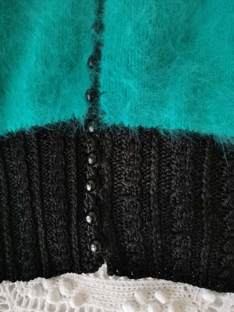 adorable petit pull en mohair vert avec bas et poignets en tricot"élastique" noir, tricoté main.Petits boutons noirs sur toute la longueur (il peut donc s'ouvrir entièrement). Incroyablement doux et chaud. l'emmanchure est assez large, en revanche, il souligne la taille, pour une silhouette très 80's.