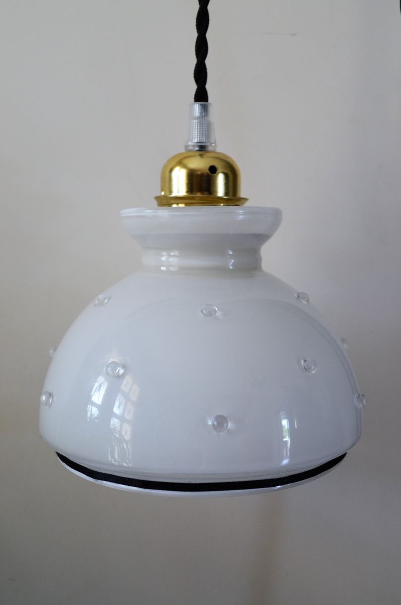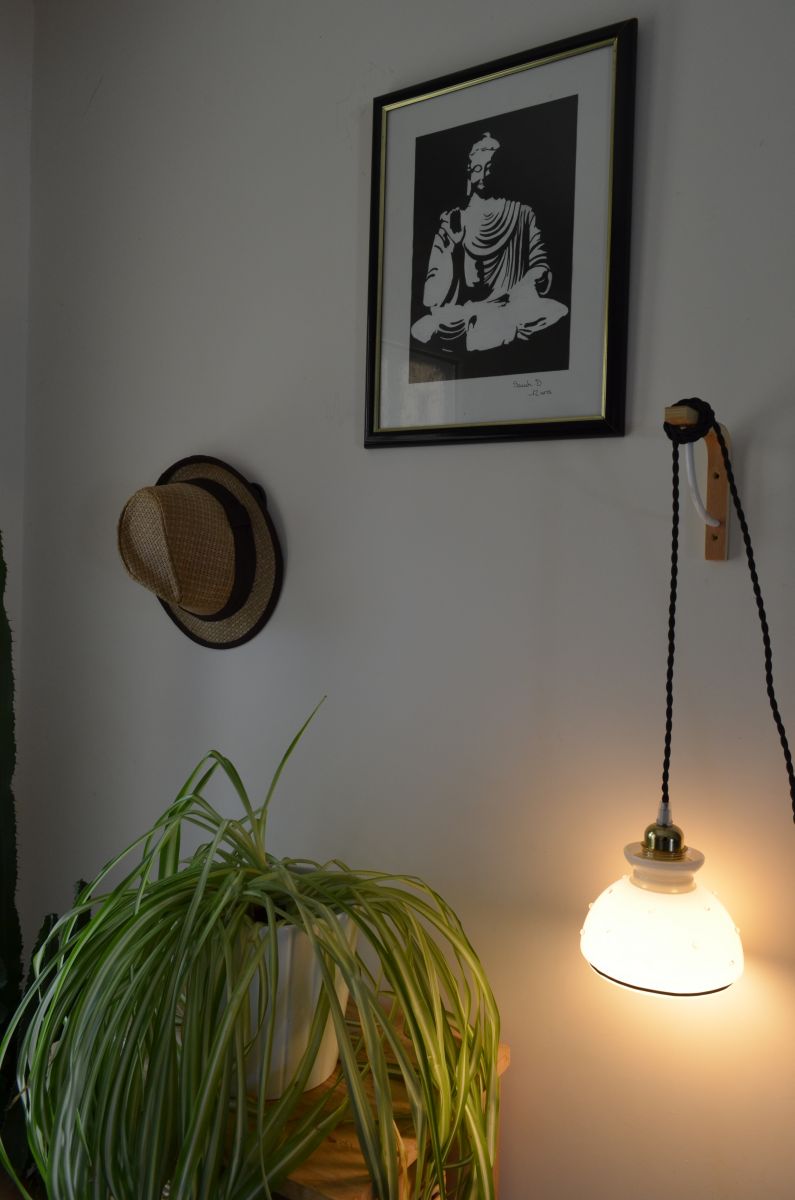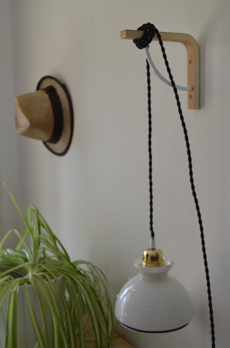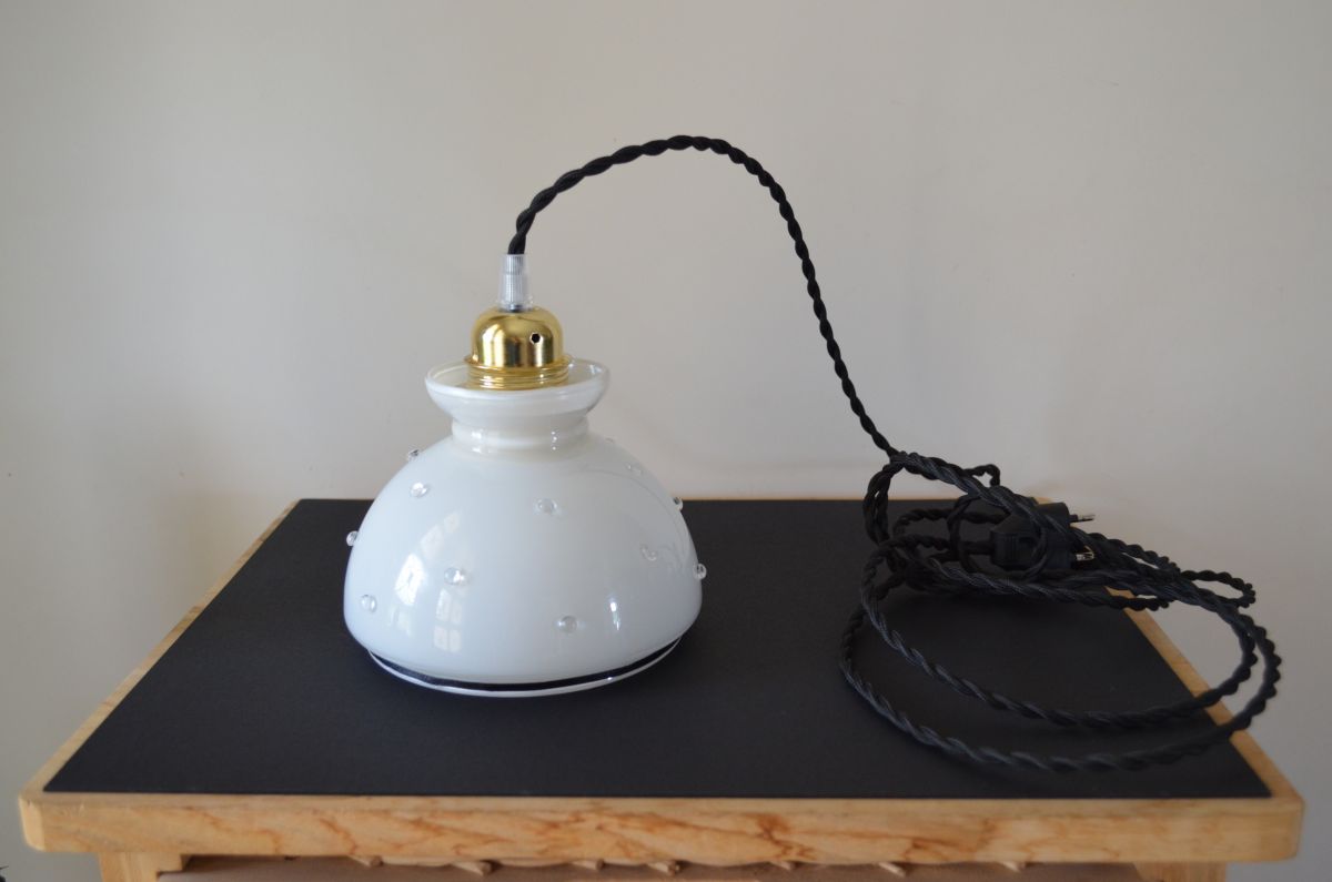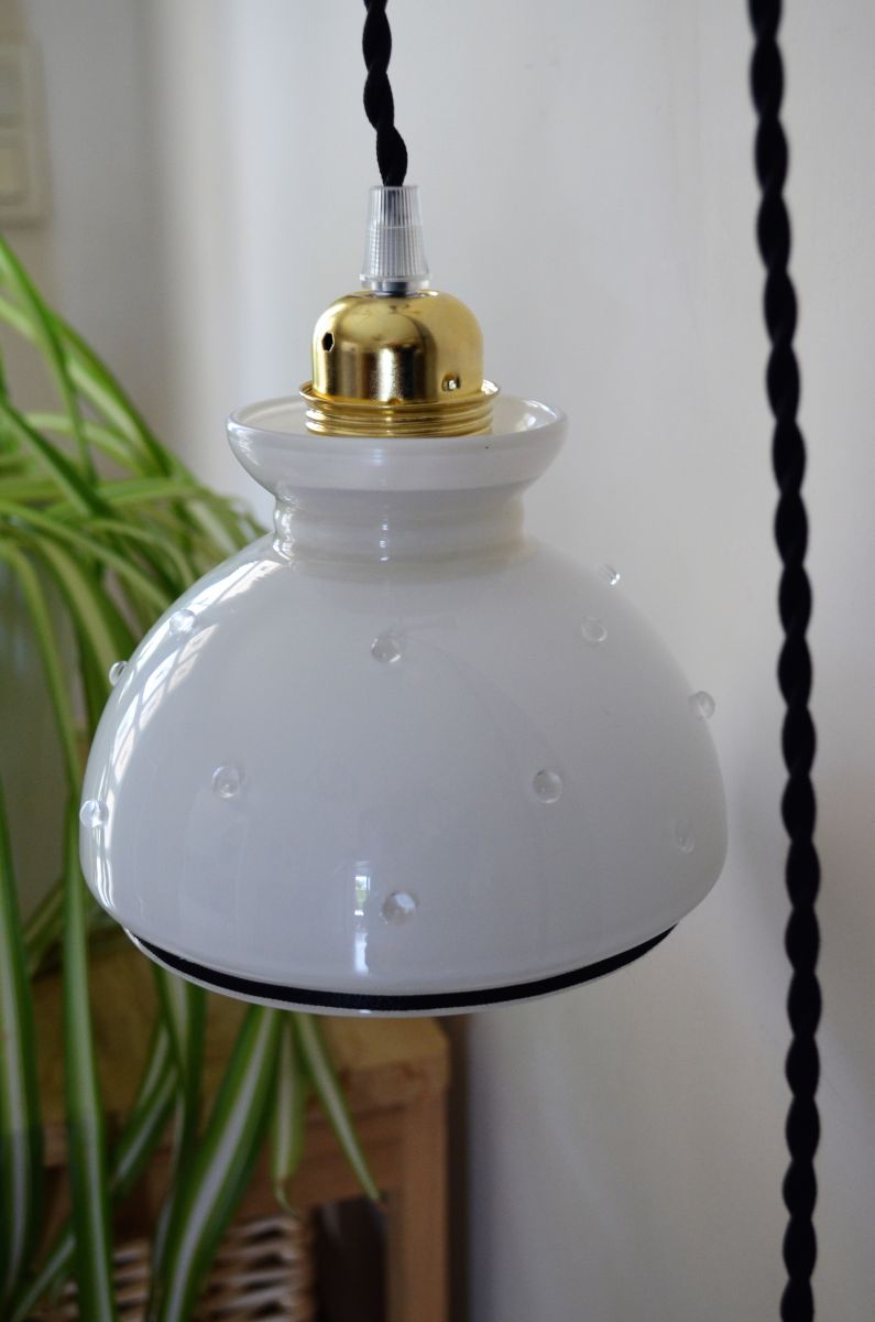 Lampe baladeuse vintage créée par mes soins à partir d'un ancien globe de lustre chiné. A utiliser en baladeuse ou en lampe à poser, selon votre goût.