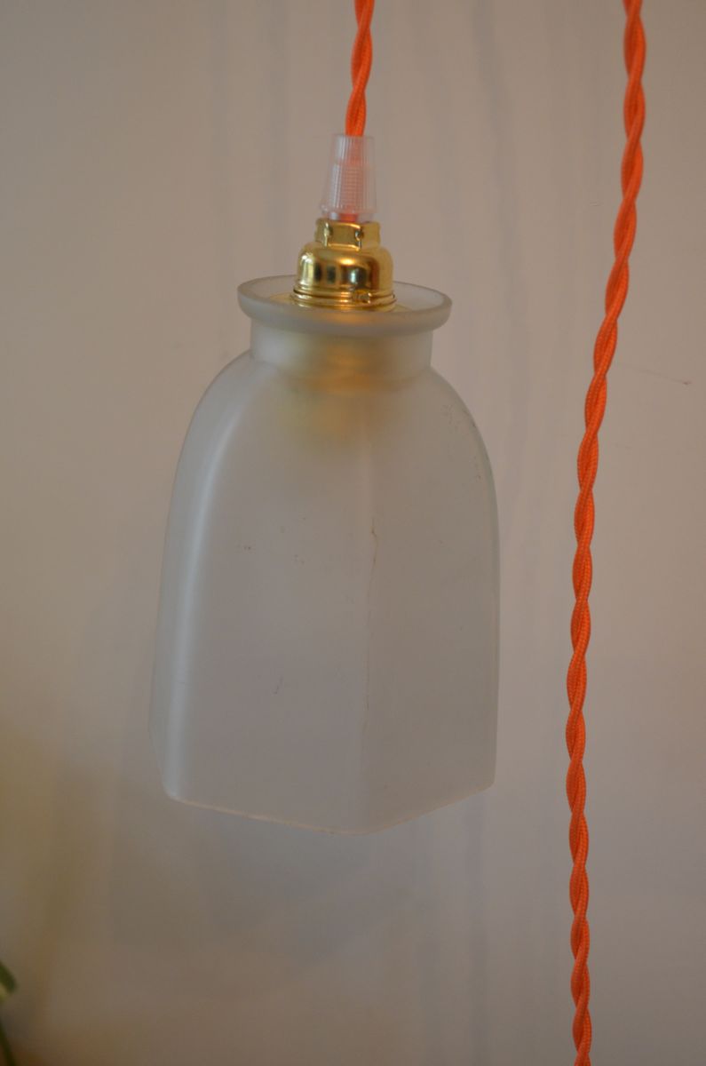 Electricité entièrement refaite : douille laiton, câble torsadé en textile de couleur de 2,5 m, interrupteur (indiquez moi l'emplacement souhaité ;-), fiche mâle. Verre dépoli.