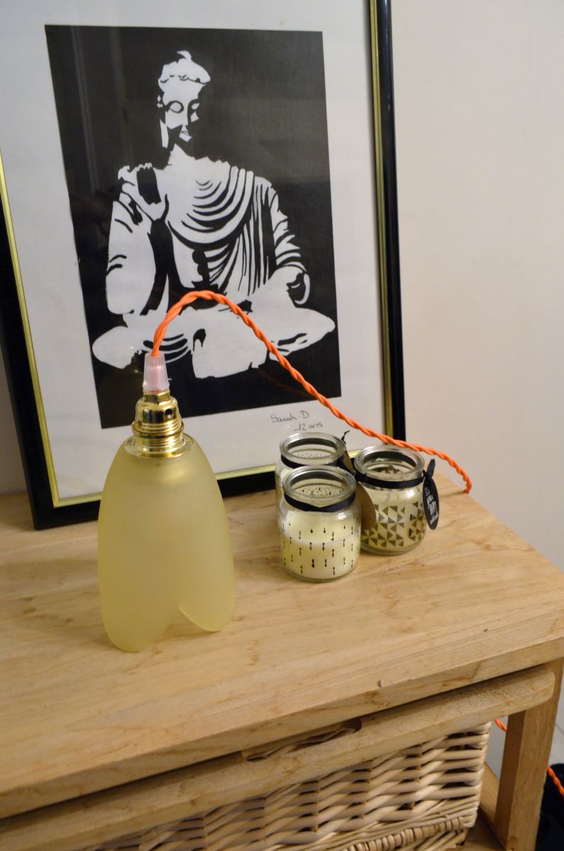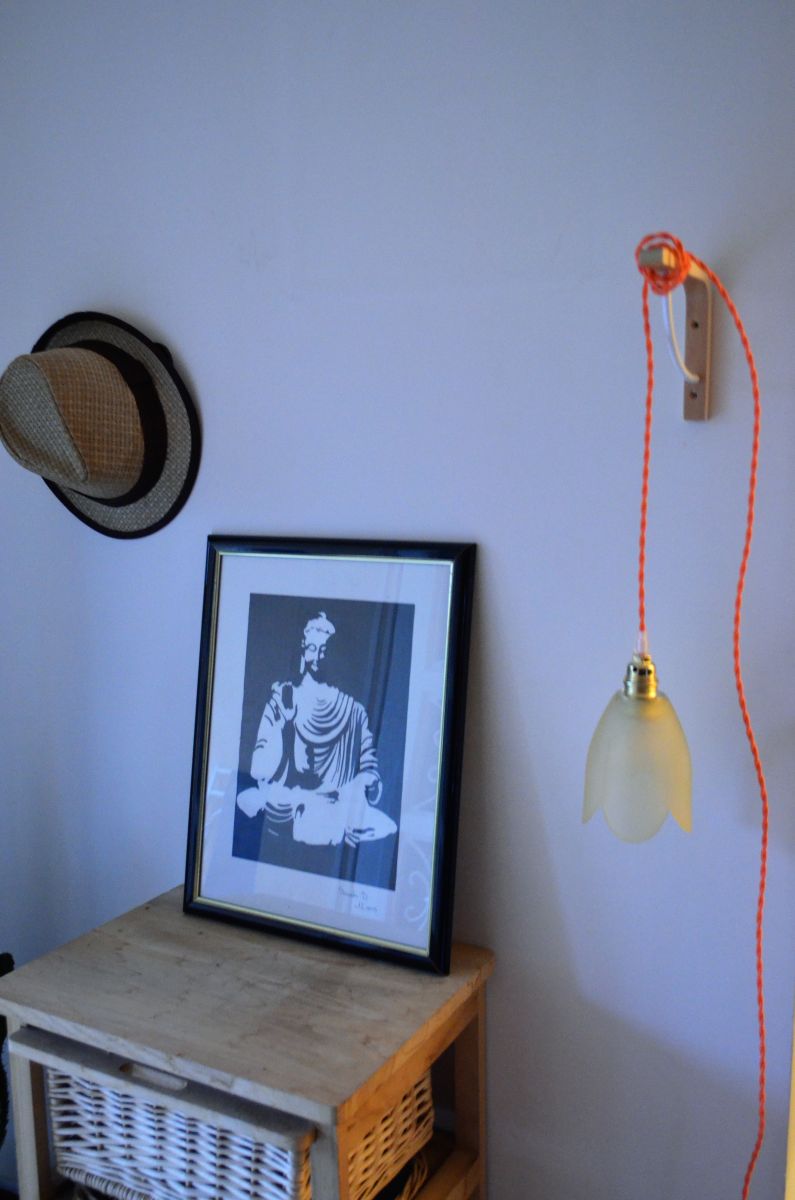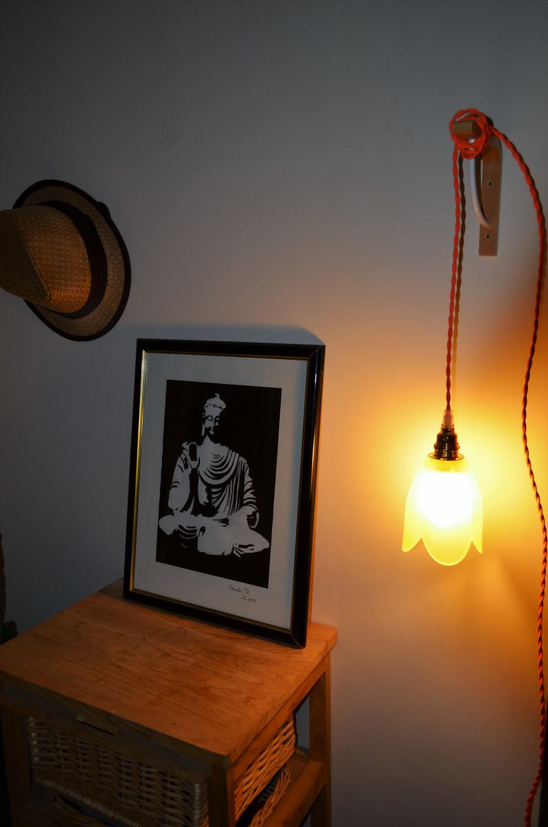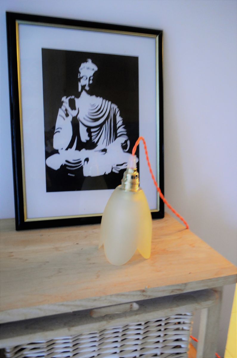 Lampe baladeuse vintage créée par mes soins à partir d'un ancien globe de lustre chiné. Le verre dépoli est légèrement teinté. A poser ou à suspendre, elle ensoleillera votre intérieur !