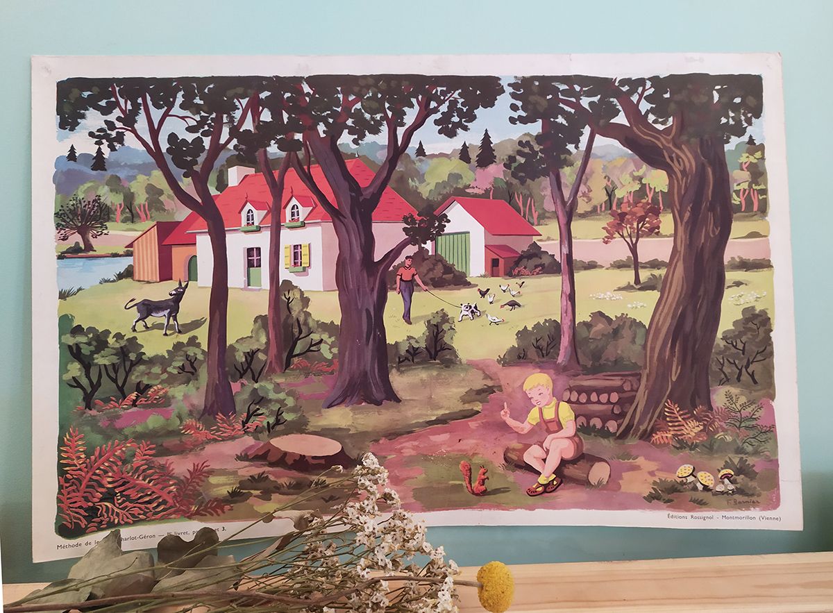 Affiche scolaire " Poucet et son ami l'écureuil". Année 1950