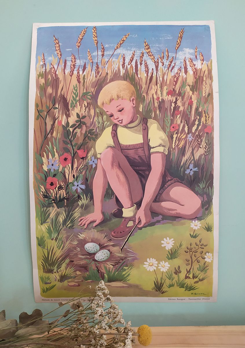 Affiche scolaire " Poucet et son ami l'écureuil". Thème "le bois" et "Les œufs"