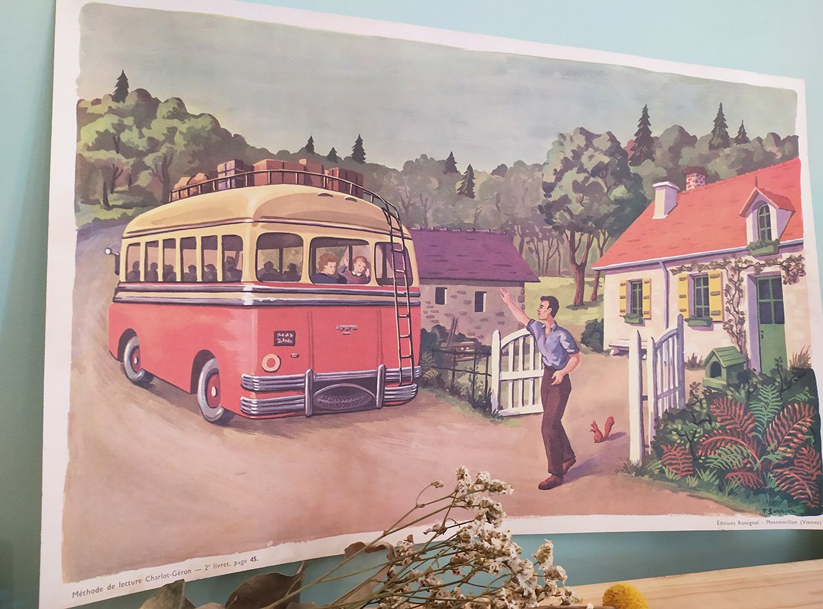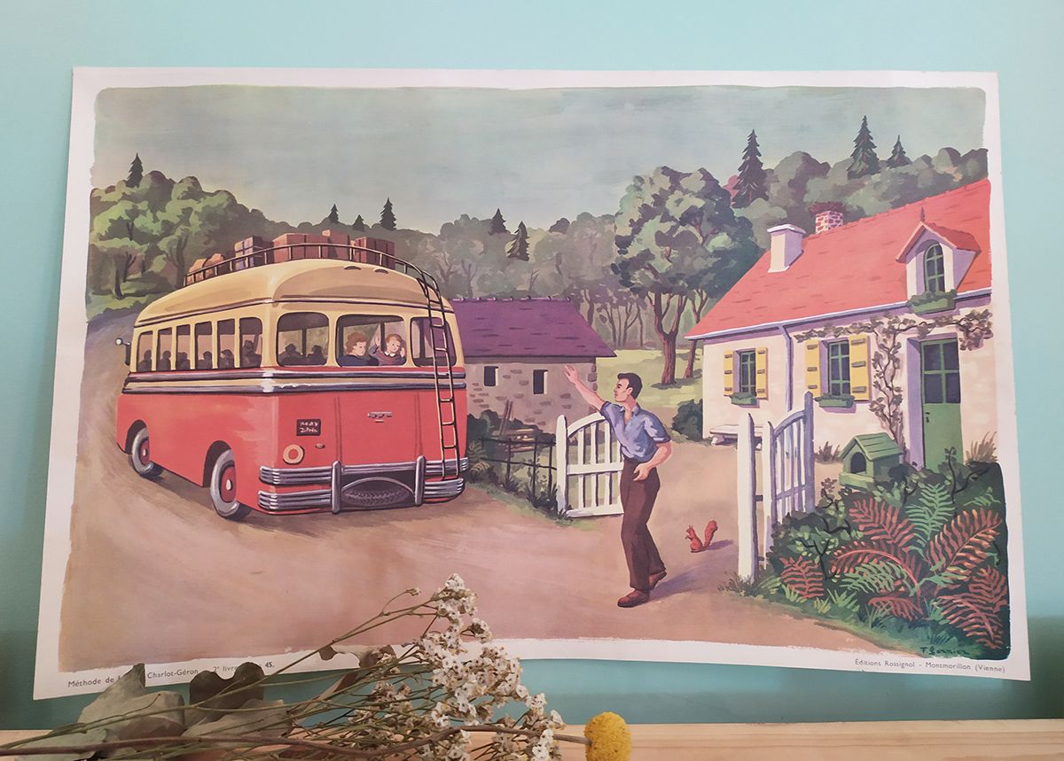 Affiche scolaire " Poucet et son ami l'écureuil". Thème "Le bus" et "La cigogne"
