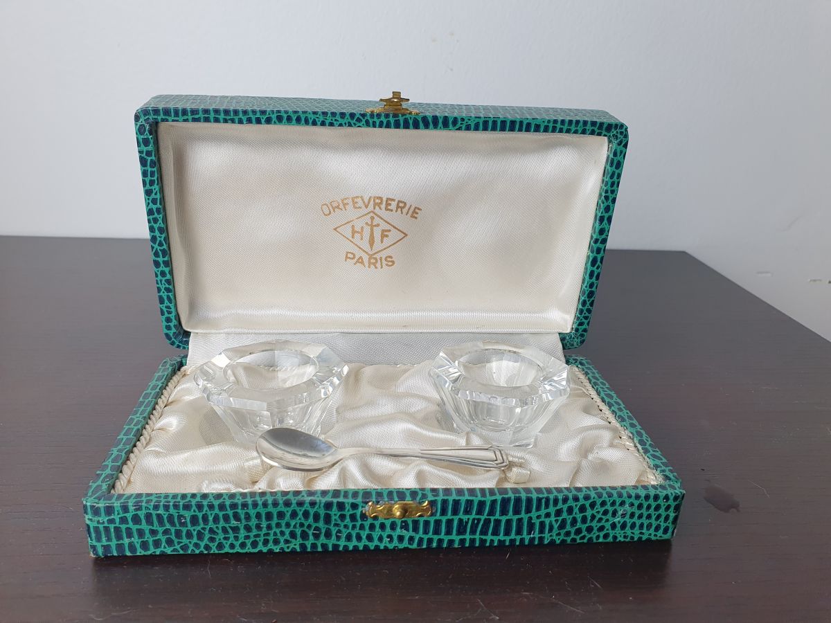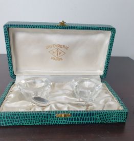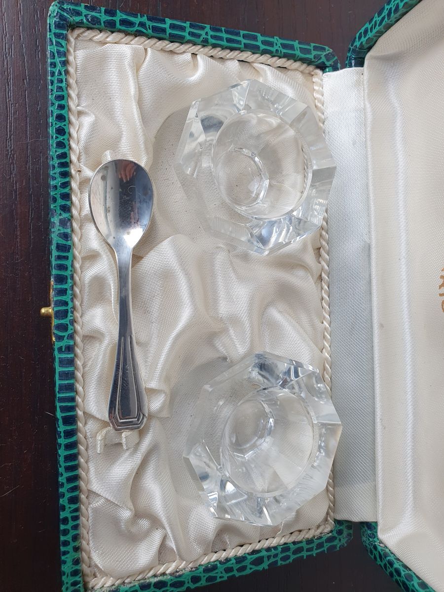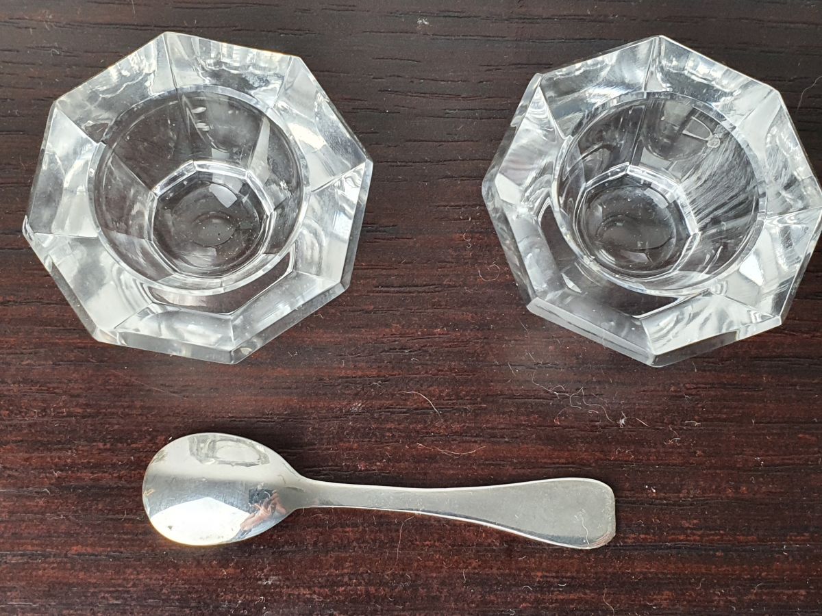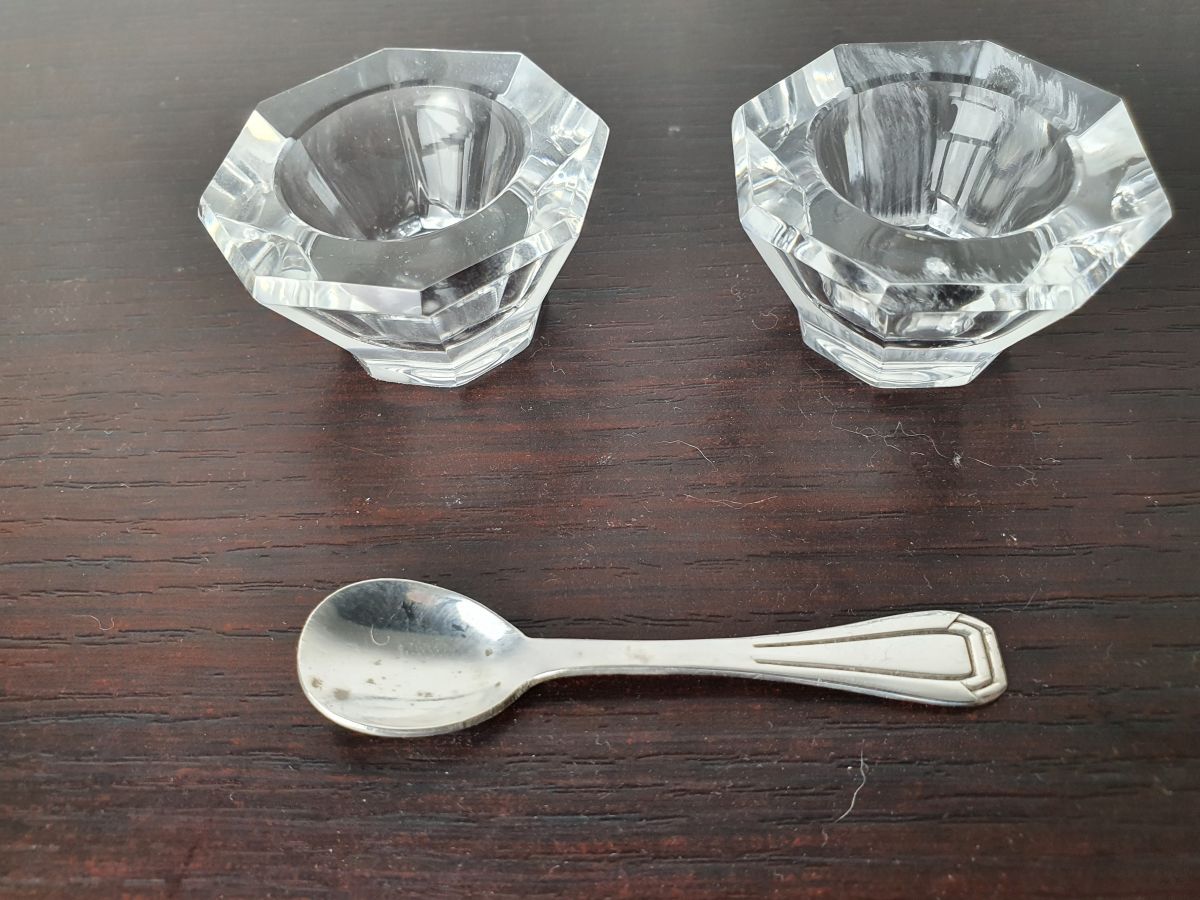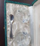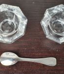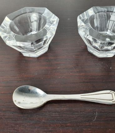 Ensemble 2 coupelles pour sel et poivre en verre avec petite cuillère. Celle-ci ne fait sans doute pas partie du coffret d'origine mais convient malgré tout.