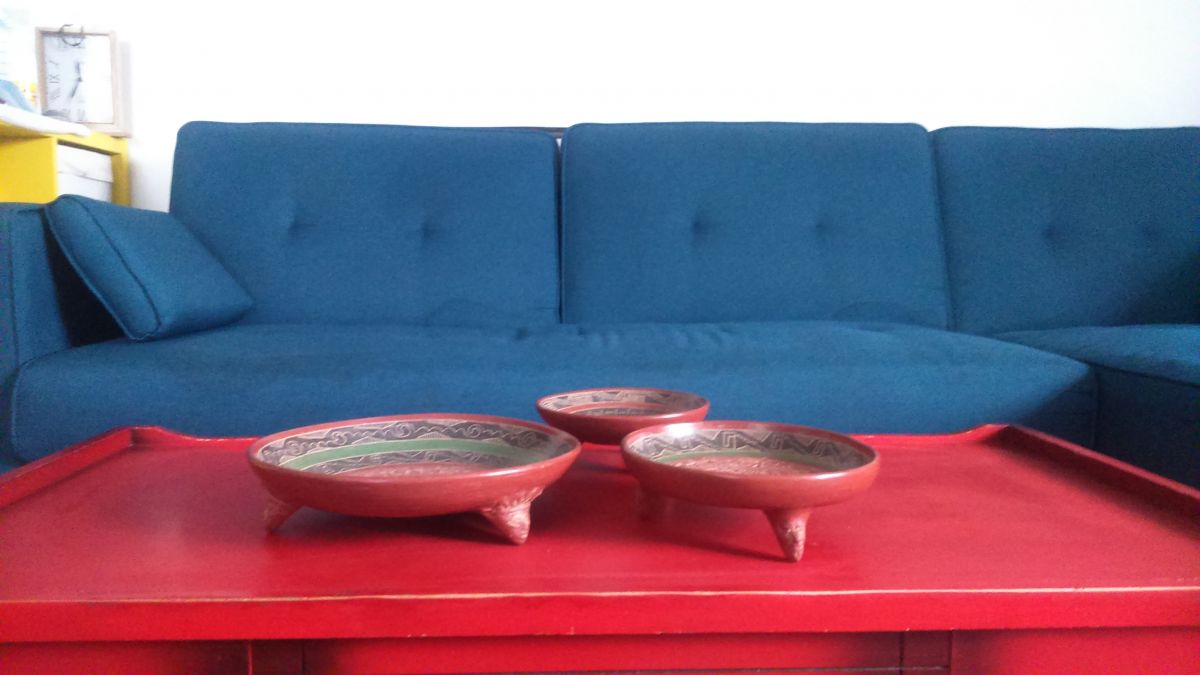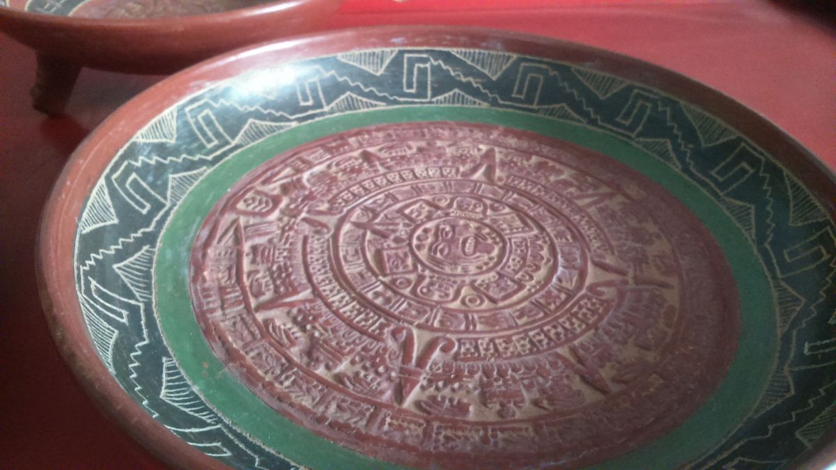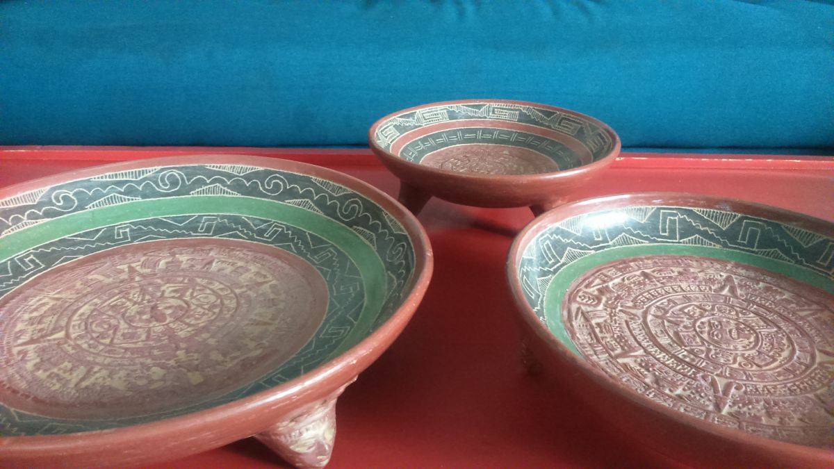 Impressionnants lot de 3 plats d'origine aztèque, maya, inca. Ils sont en terre cuite et avec des motifs différents. Fabrication artisanale, la patine des plateaux montrent qu'il ne date pas d'aujourd'hui. On peut voir qu'ils ont été peints à la main ( irrégularités dans les traits).
