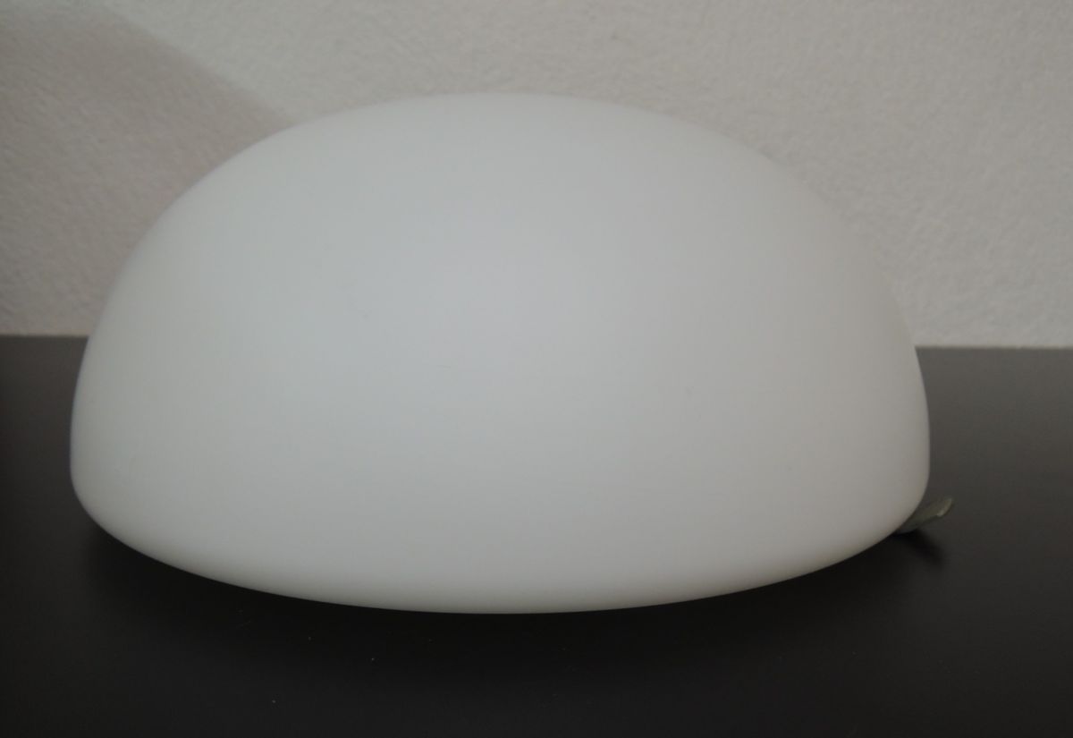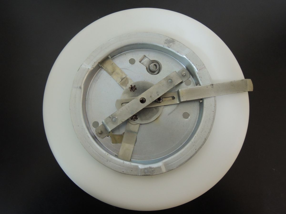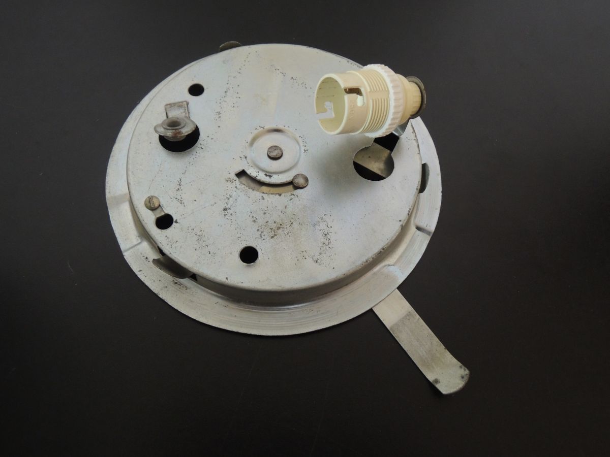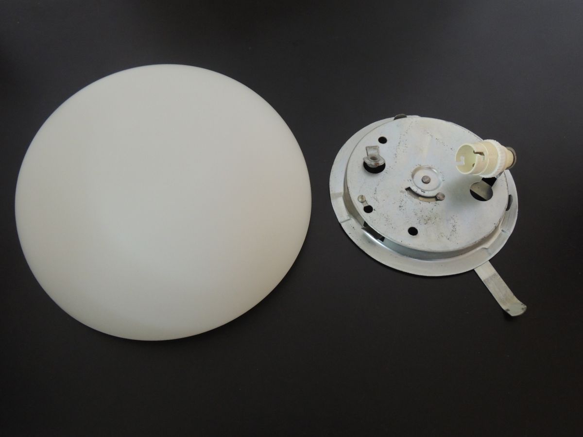 Plafonnier vintage en très bon état, globe en opaline mat de 25 cm de diamètre, support en acier galva à "tirettes", avec quelques "piqûres", équipé d'une douille à baïonnette en plastique de type B22 (peut se changer par douille à vis), non câblé.