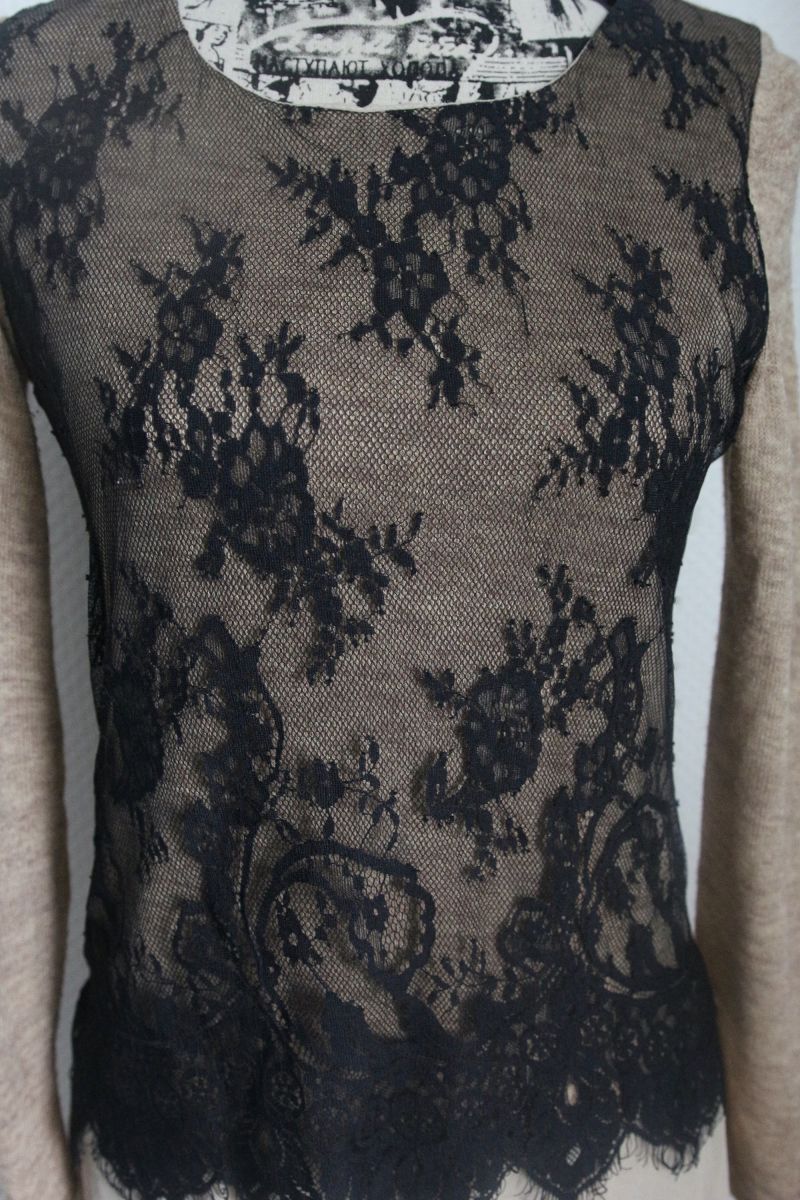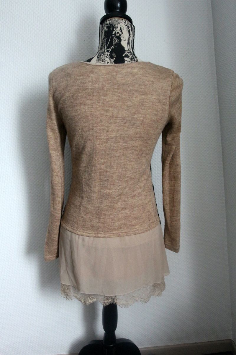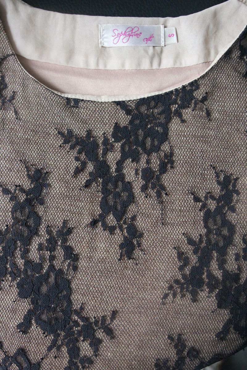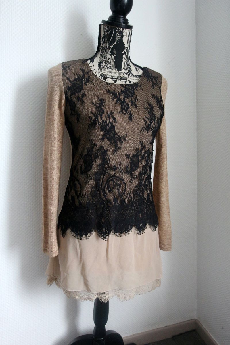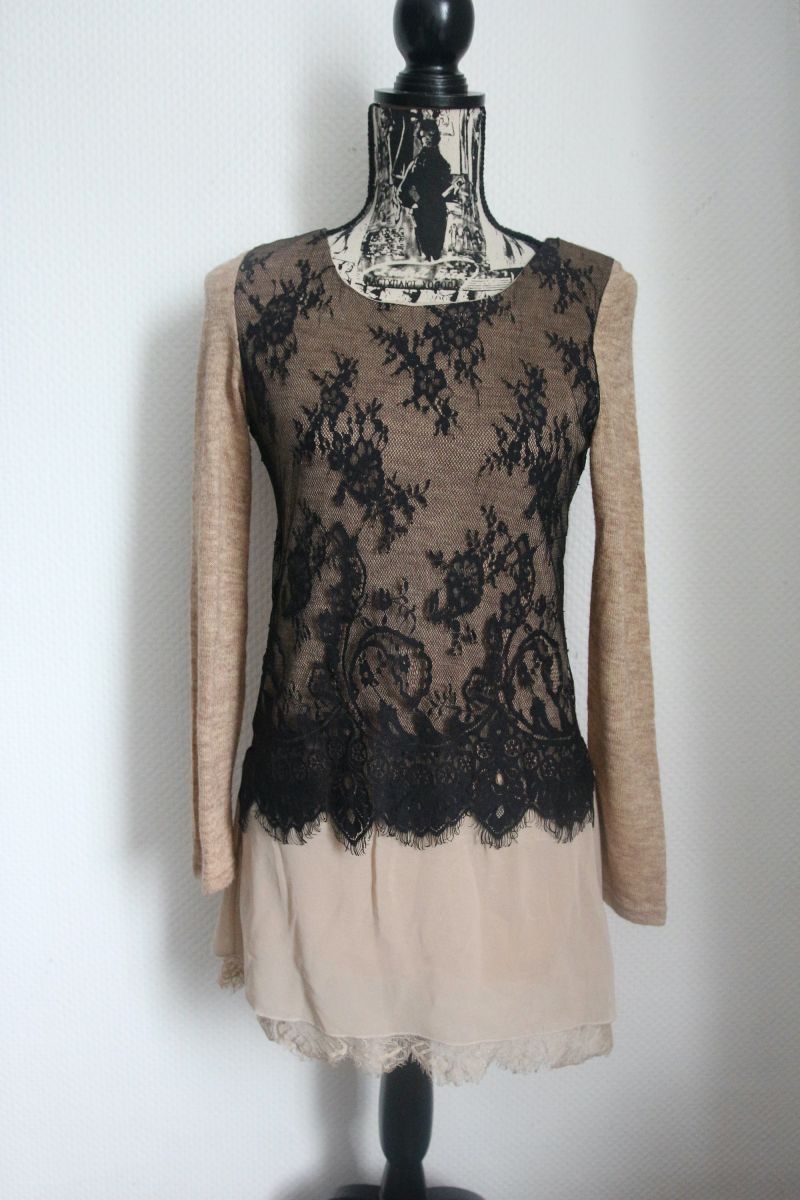 Très joli haut style rétro composé de deux matières et de deux couleurs. La dentelle noire se superpose à la tunique beige. Taille S