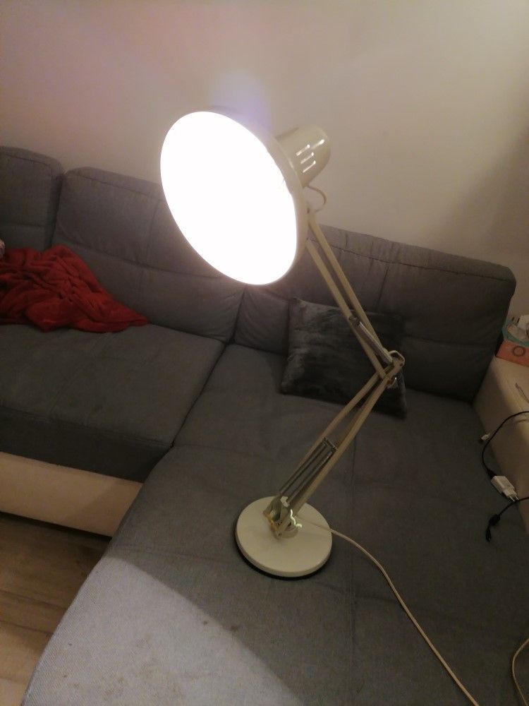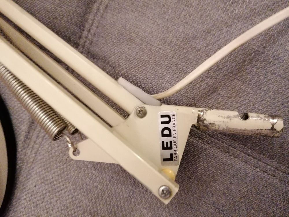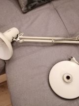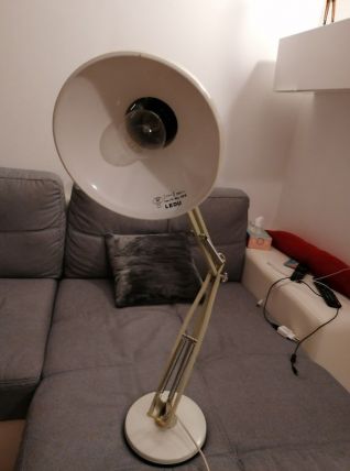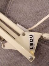 Lampe Ledu articulée en métal laqué blanc sur socle. Années 1970, de type Industrielle. Diamètre du socle de 19 cm.Longueur du bras articulé de la lampe : 40 X 2. Poids total plus entre 5 et 6 kg.