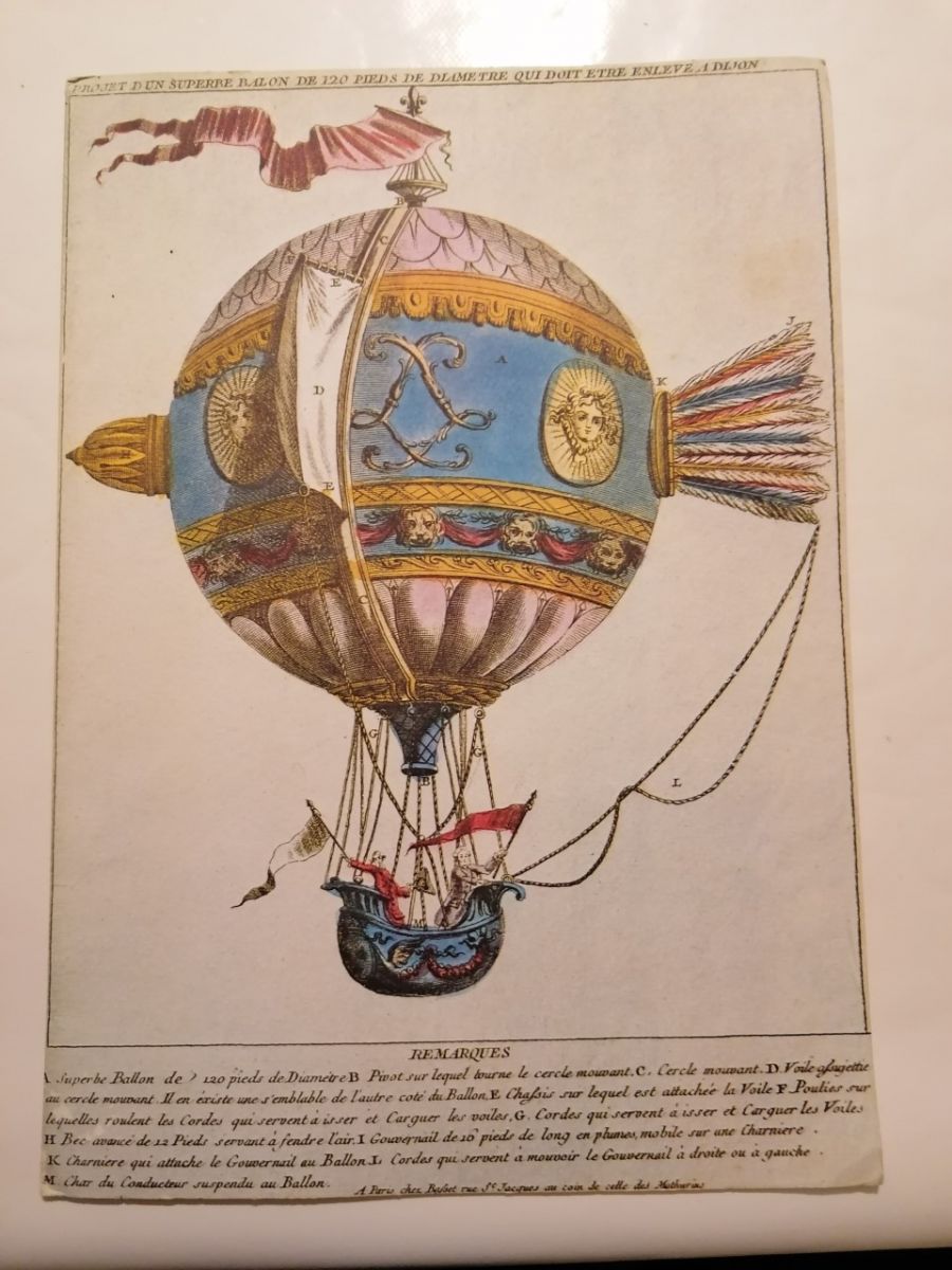 Couverture : reproduction eau-forte reprise au burin et coloriée "Projet d'un superbe ballon". Éditée à Paris chez Basset, rue St Jacques. Estampes "Au ballon" de la collection Edmond de Rothschild. Contient un feuillet central avec le détail du menu.