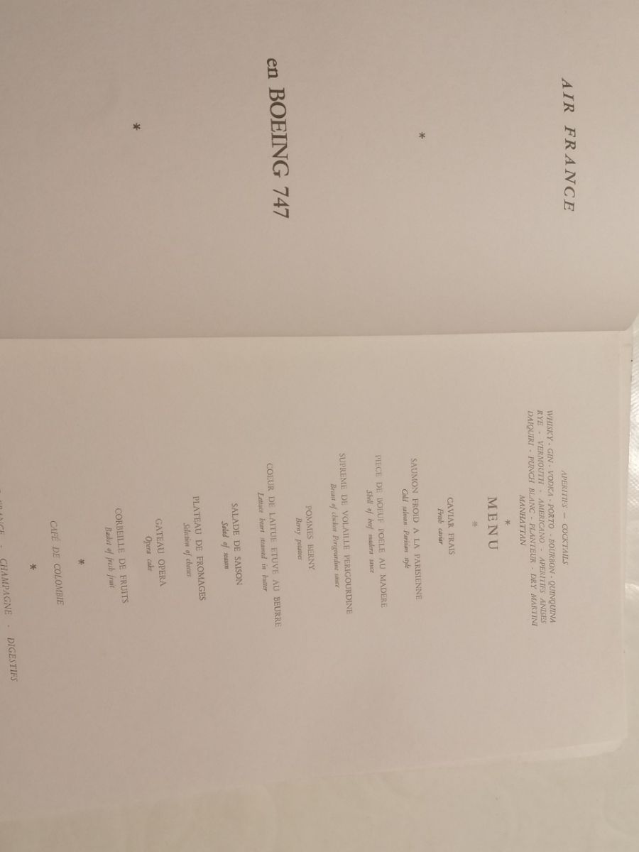 Menu original ancien en couleurs sur papier Air France en Boeing 747.C19.