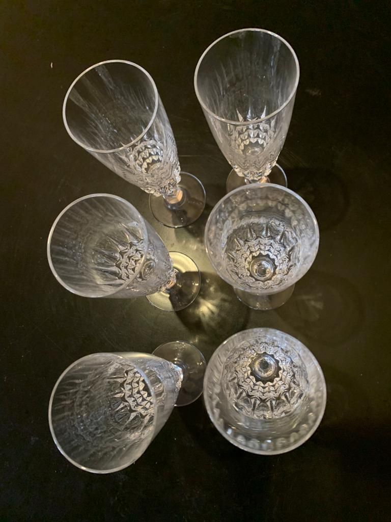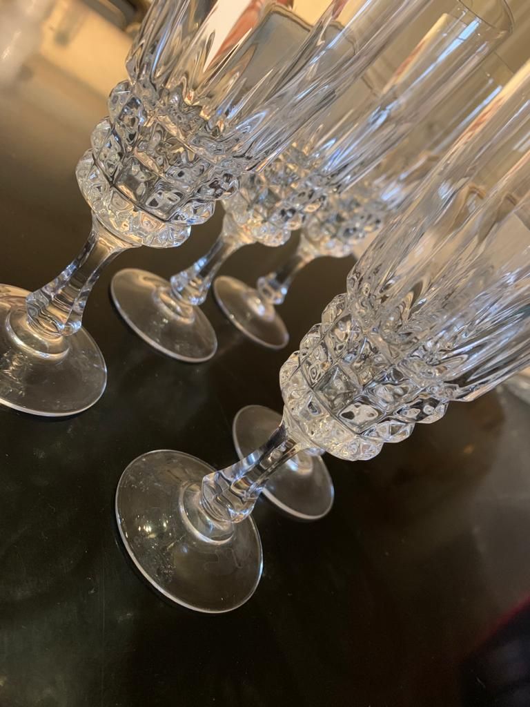 Un service de six flûtes à champagne en cristal taillé.