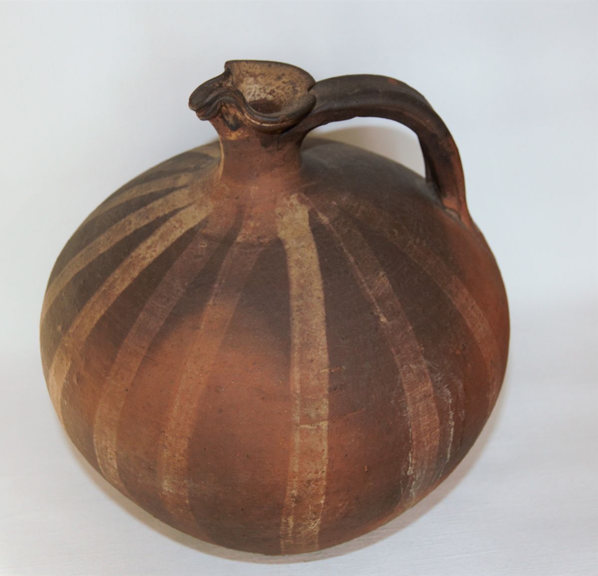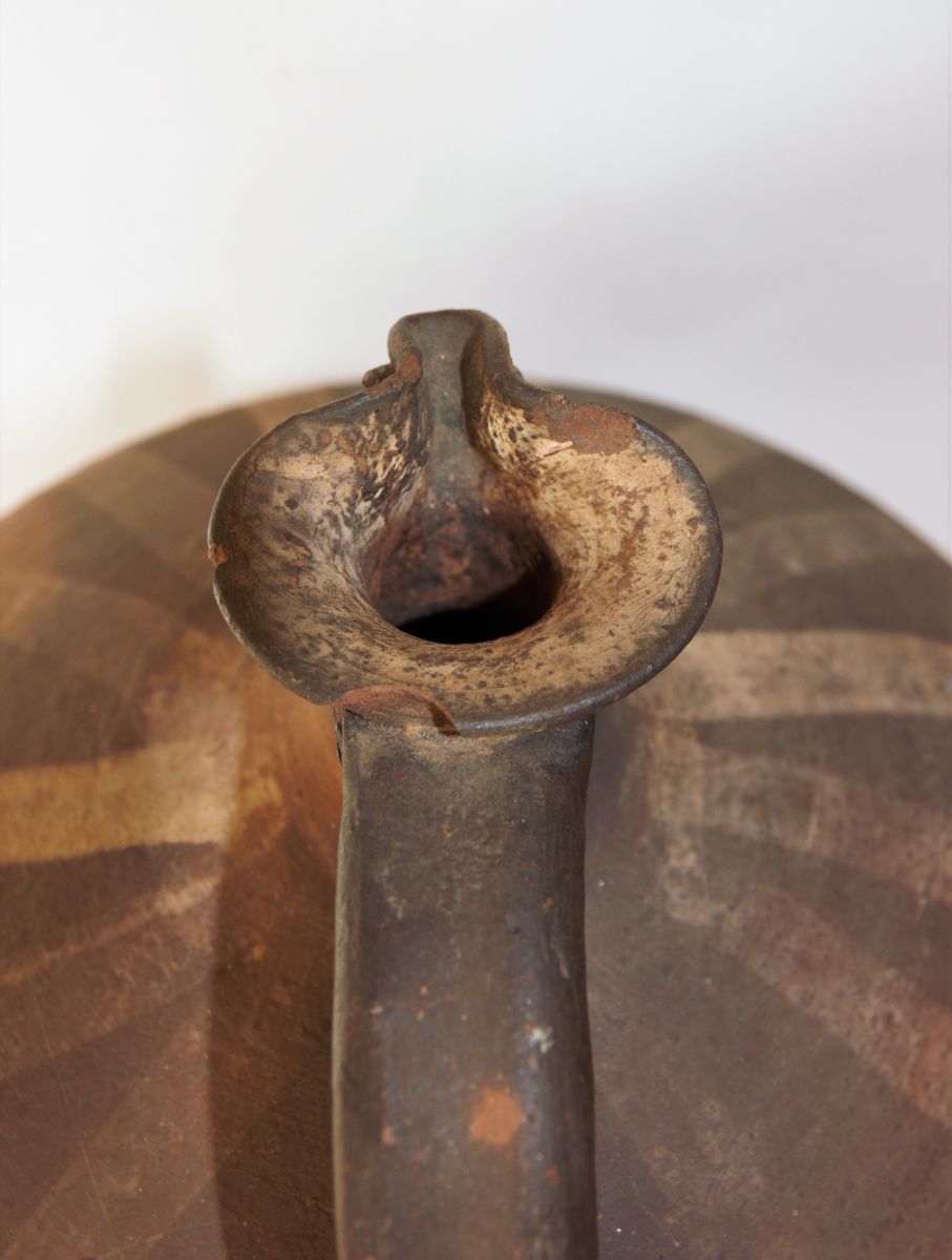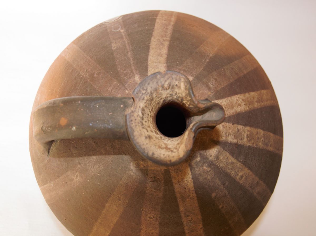 Terre cuite réhaussée d'un décor linéaire à englobe clair rayonnant tout autour du goulot.