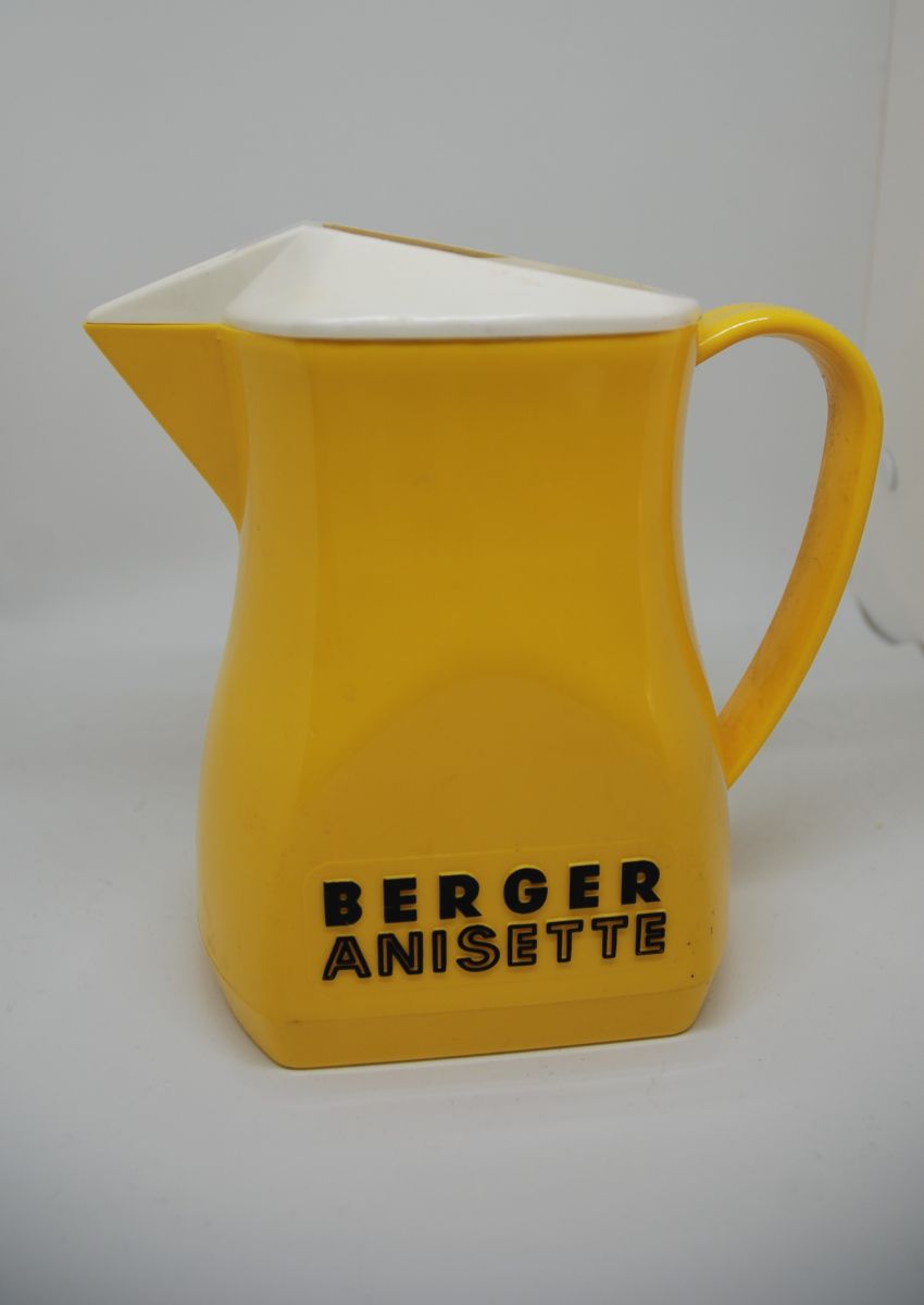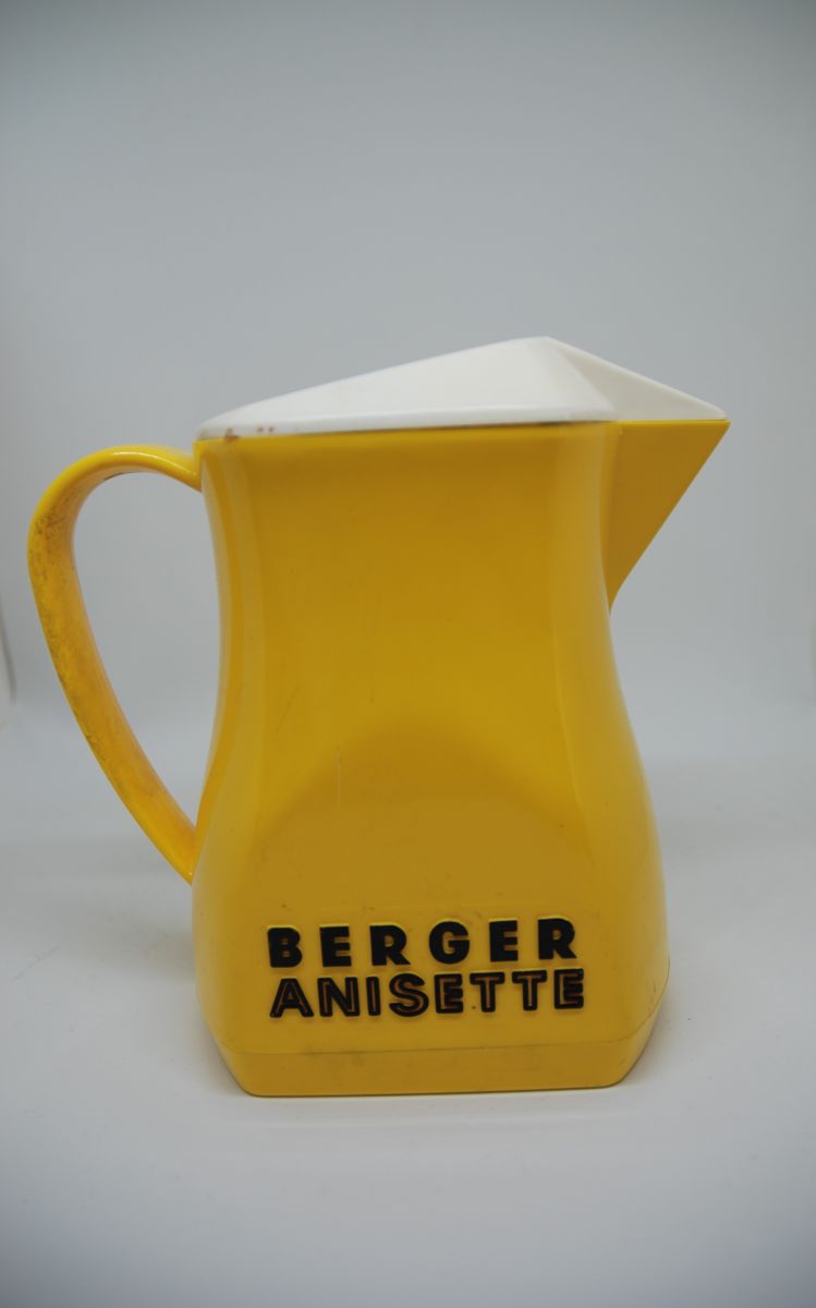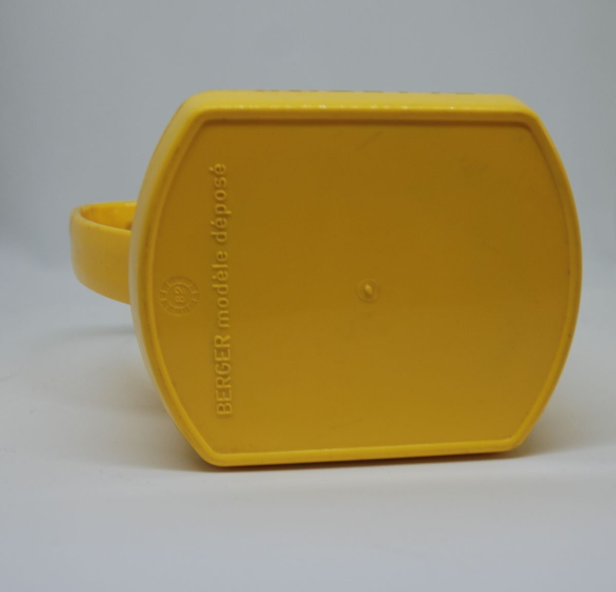 Pichet jaune en plastique de la marque Berger. Bon état général. 100 gr