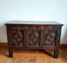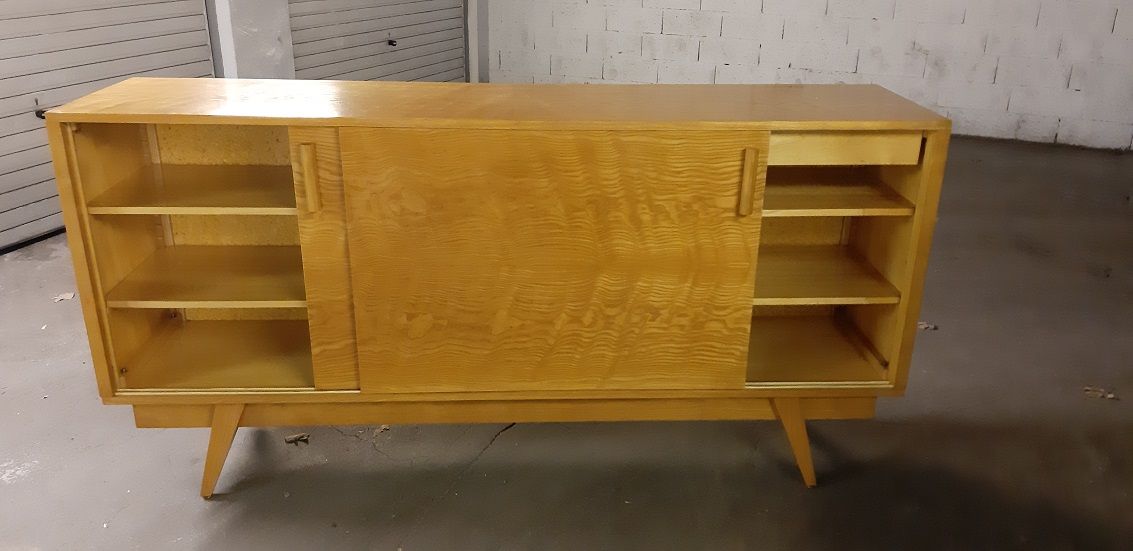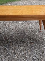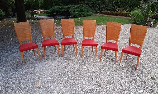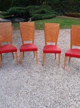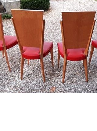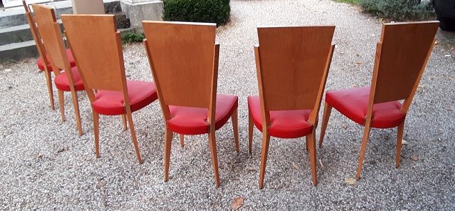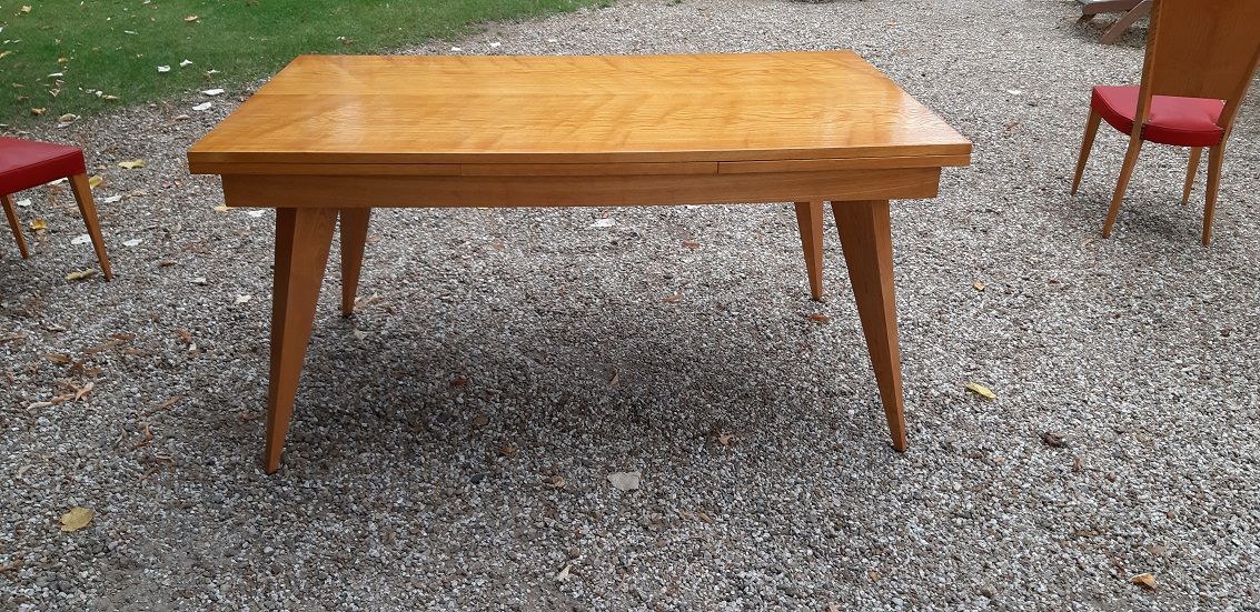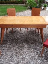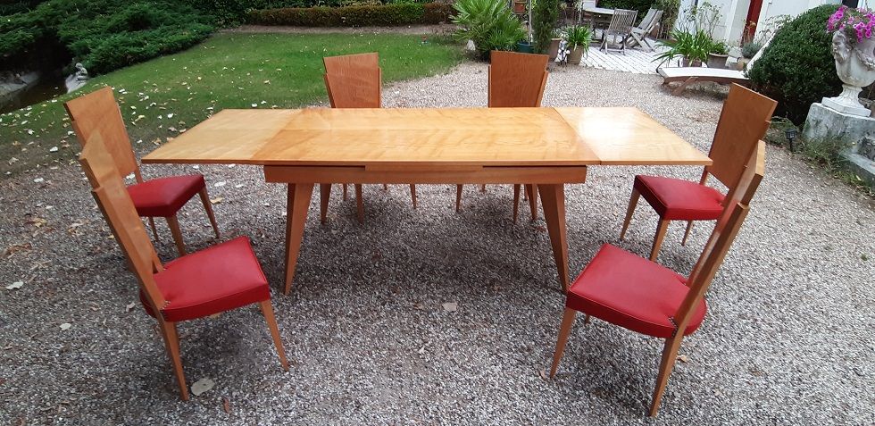 Salle à manger années 50. Excellent état. Composée d’une enfilade (longueur 210cm x Hauteur 106cm x profondeur 50cm), d’une table avec 2 allonges intégrées (longueur 150x largeur 90x hauteur 76, avec allonges longueur totale de 250) et de six chaises skaï rouge (H 100 x Largeur 42 et Hauteur assise/sol 44). Ensemble très original.