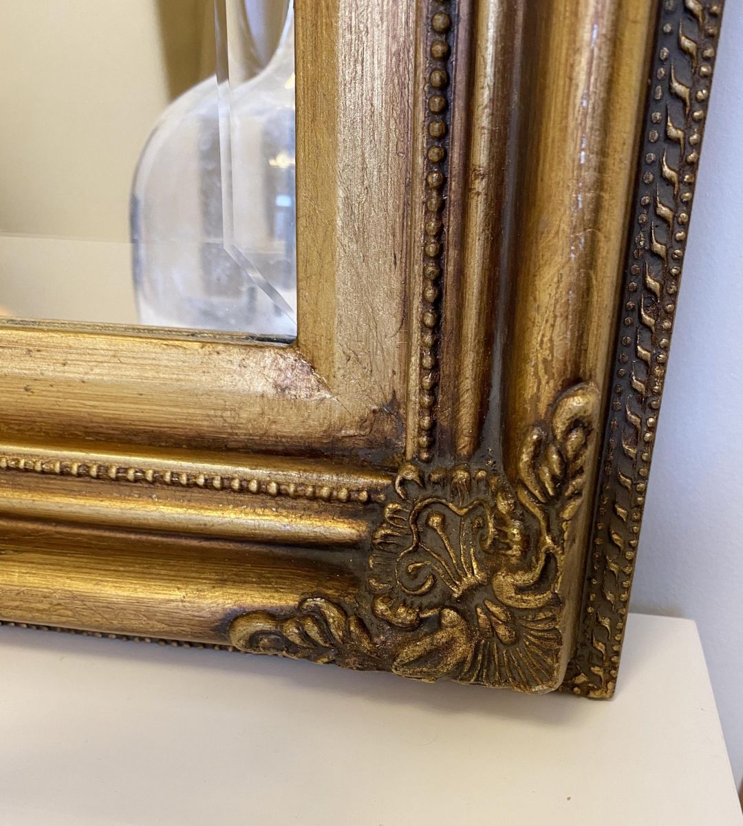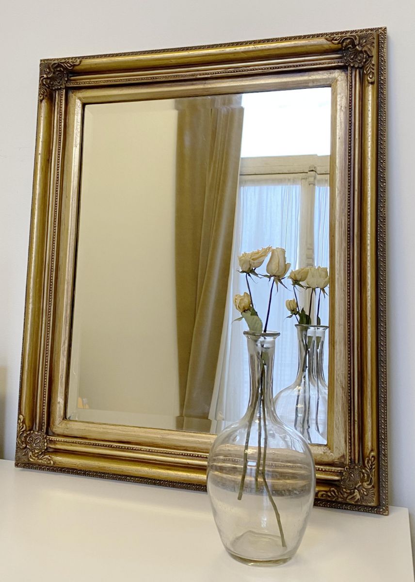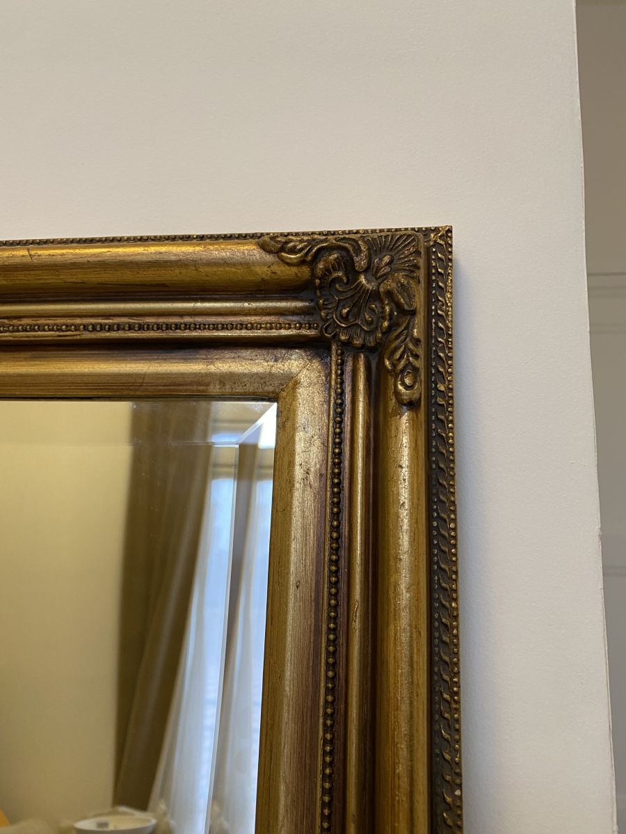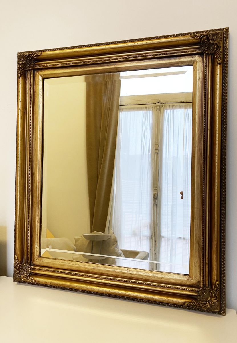 Miroir antique doré en bois et un verre biseauté de haute qualité. Excellent état .