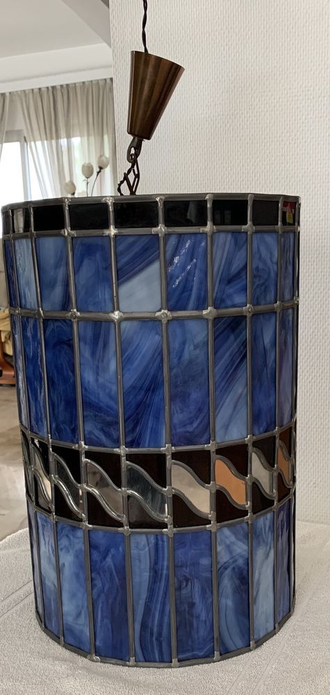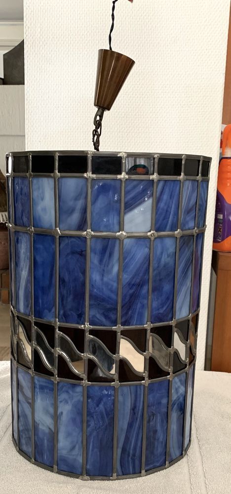 Lampe suspension cylindre vitrail. Bleu, noir et gris