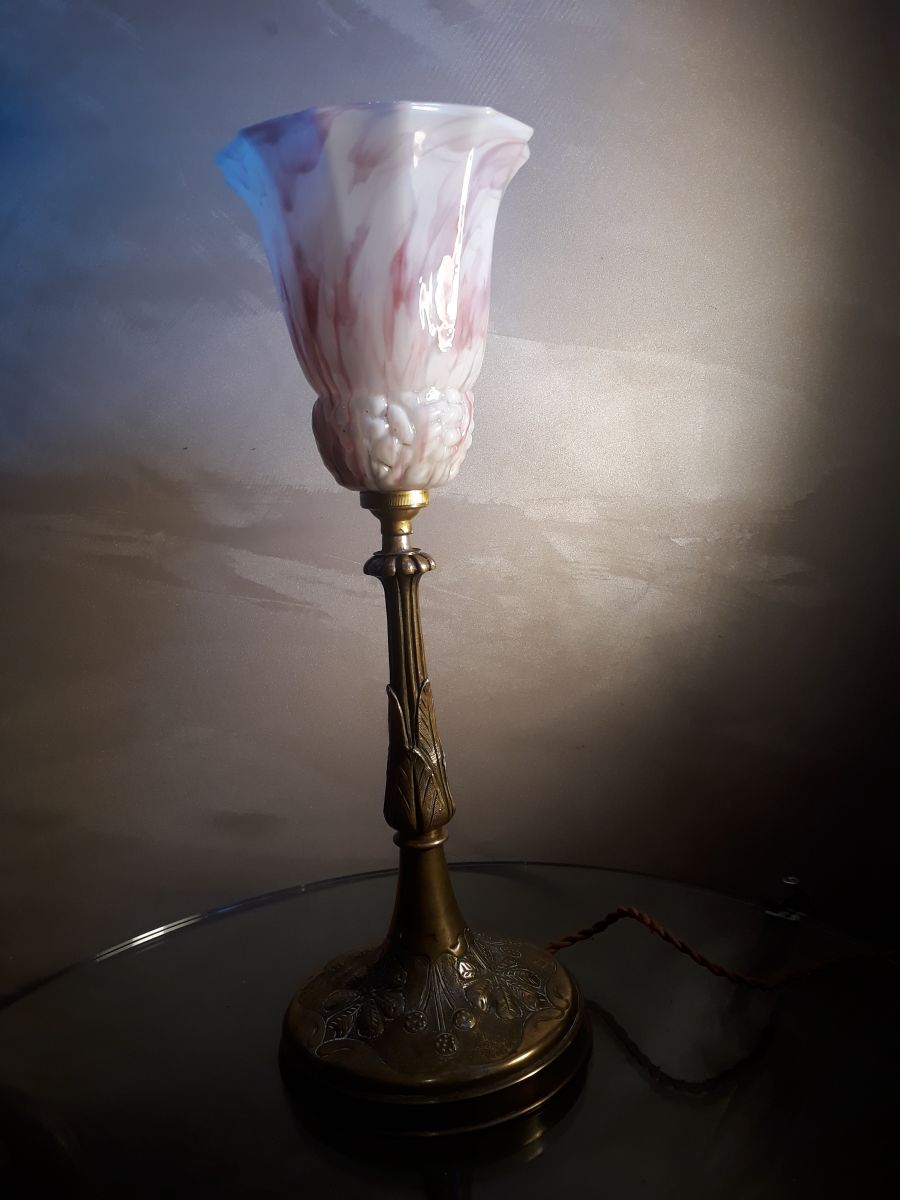 lampe pied laiton et bronze 1920 et opaline rose et blanche37x14