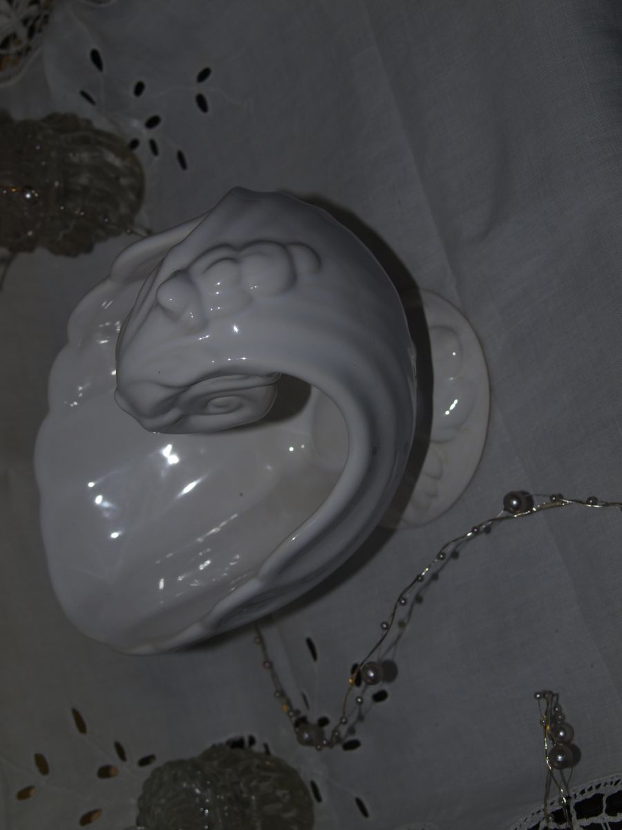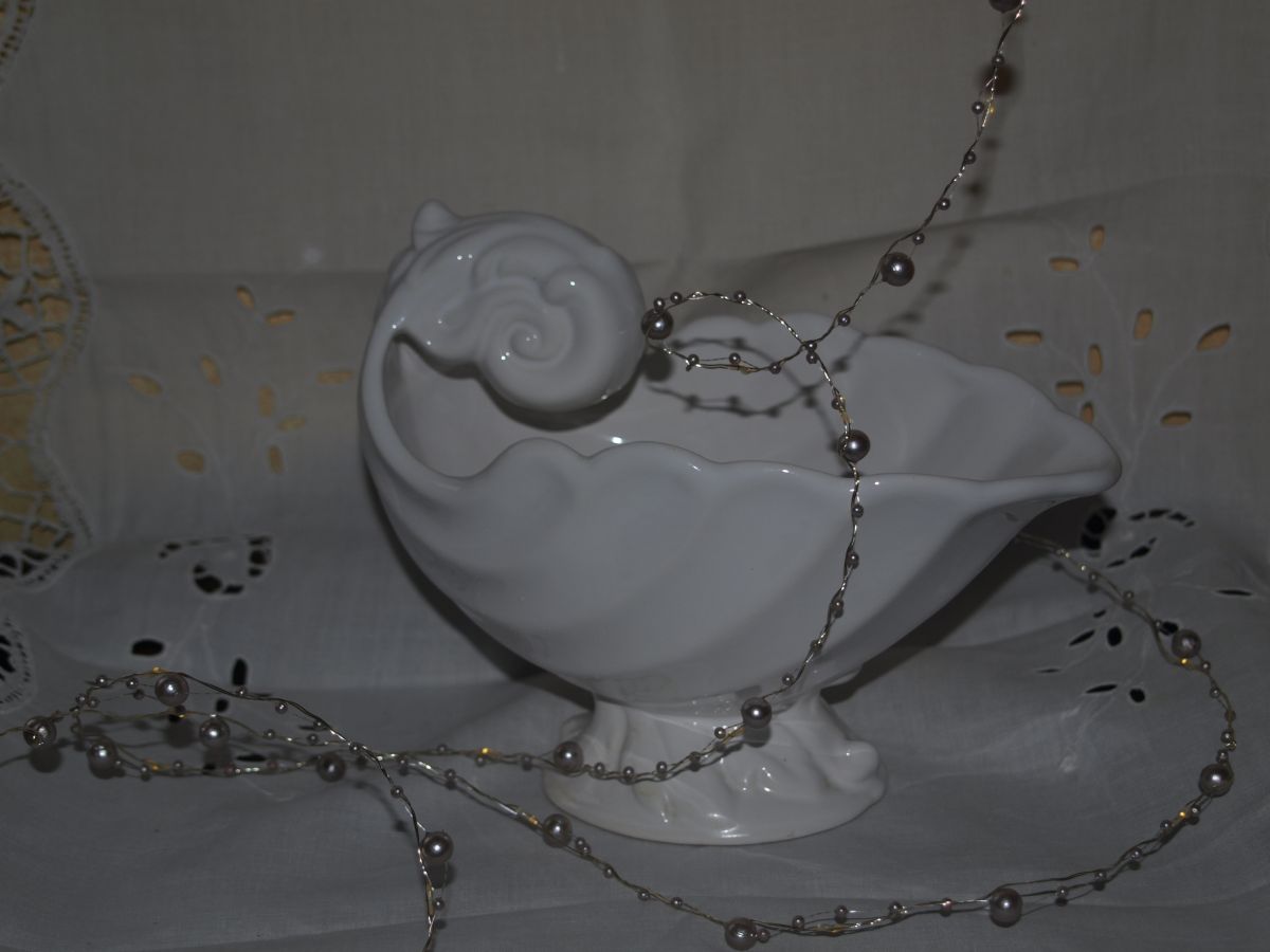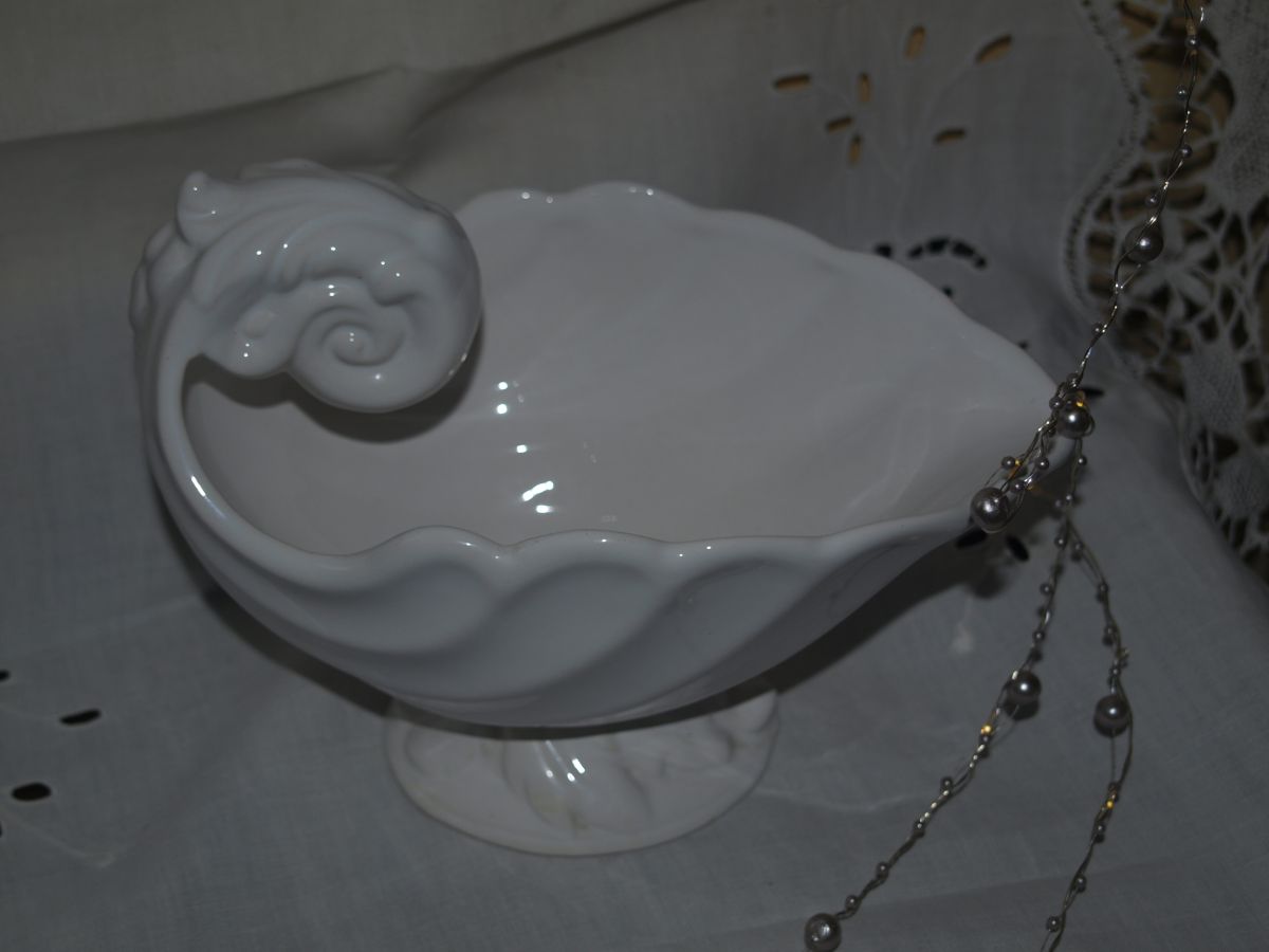 Voici une grande saucière ancienne en faïence blanche en forme de conque, très originale pour la table ou la déco.