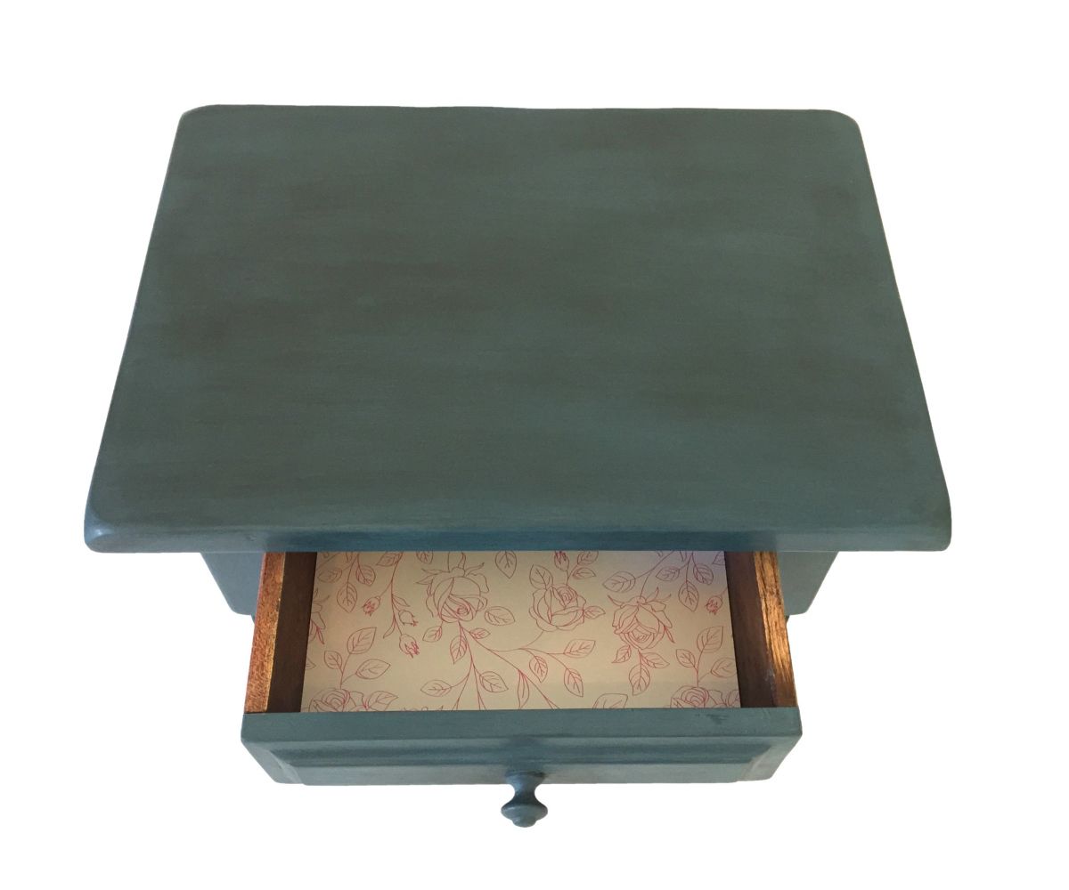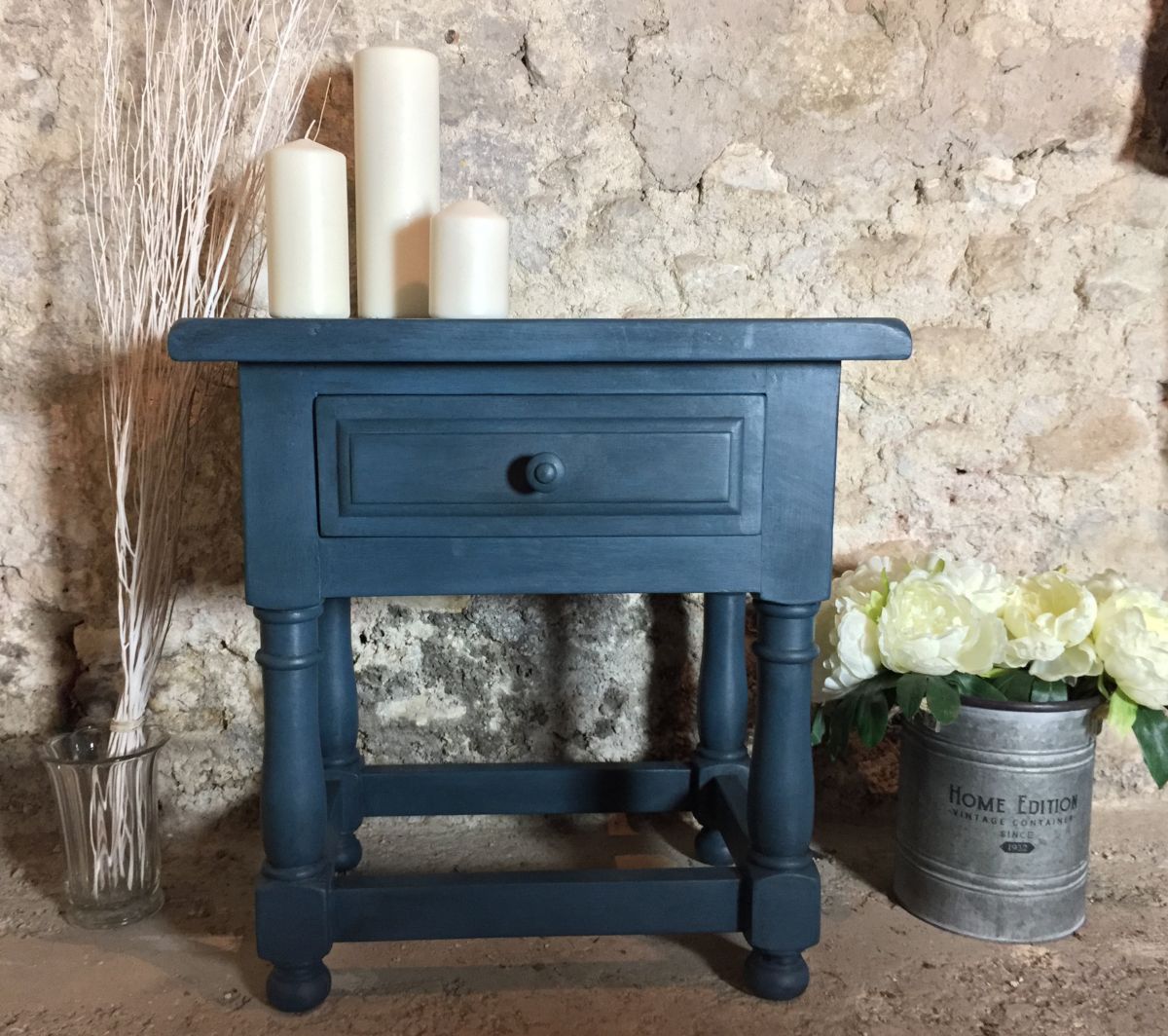 Une belle table de nuit en chêne massif, finie en bleu profond (bleu Aubusson) et scellée avec une cire noire.