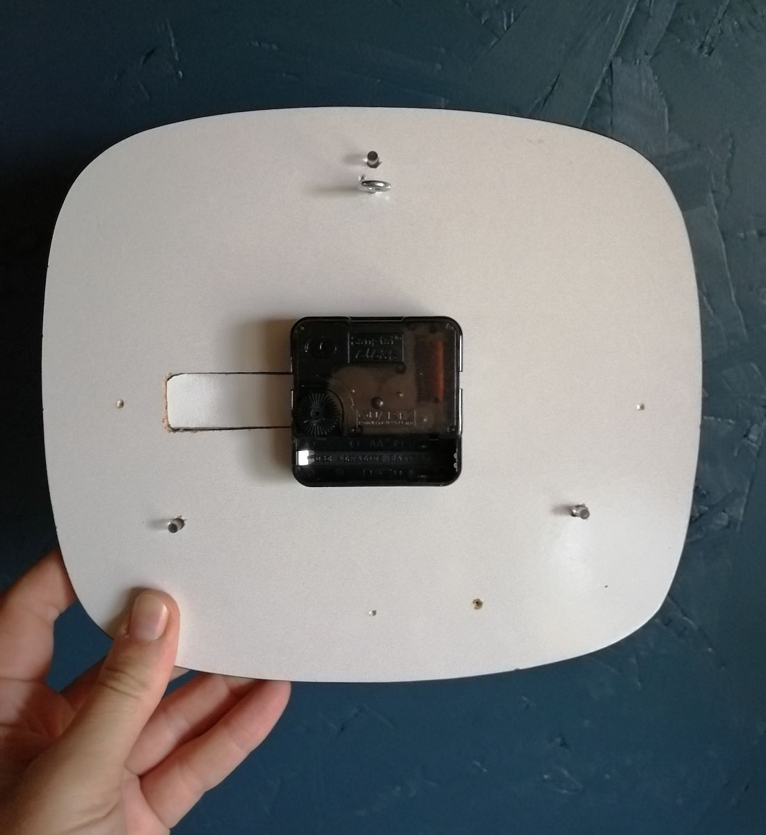 J'installe à l'arrière de l'horloge un crochet fermé. Vous pourrez l'accrocher à un clou ou une vis installée préalablement à l'endroit désiré.