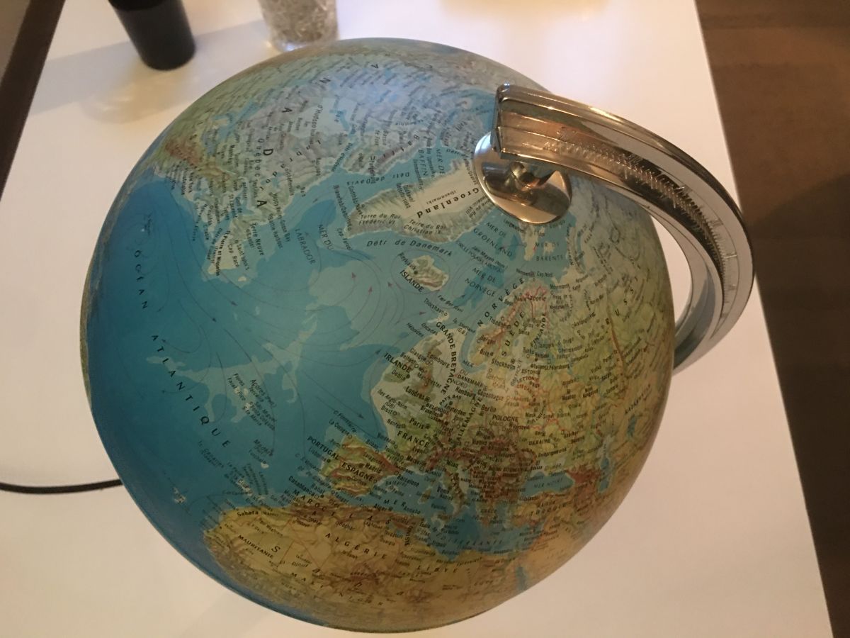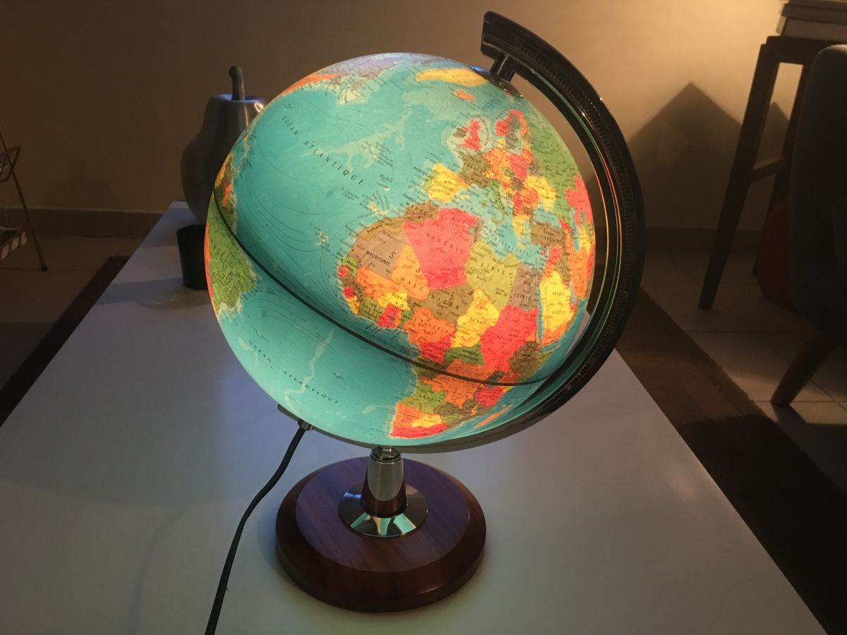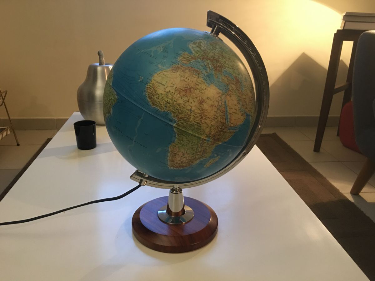 Globe terrestre/mappemonde des années 90 de marque italienne Tecnodidattica (très réputée pour sa solidité et ses cartographies précises), estampillée, globe en plastique, pied en bois, hauteur 40cm, diamètre 25cm, diamètre piétement 17cm, en parfait état de fonctionnement, aucun manque, très bon état.