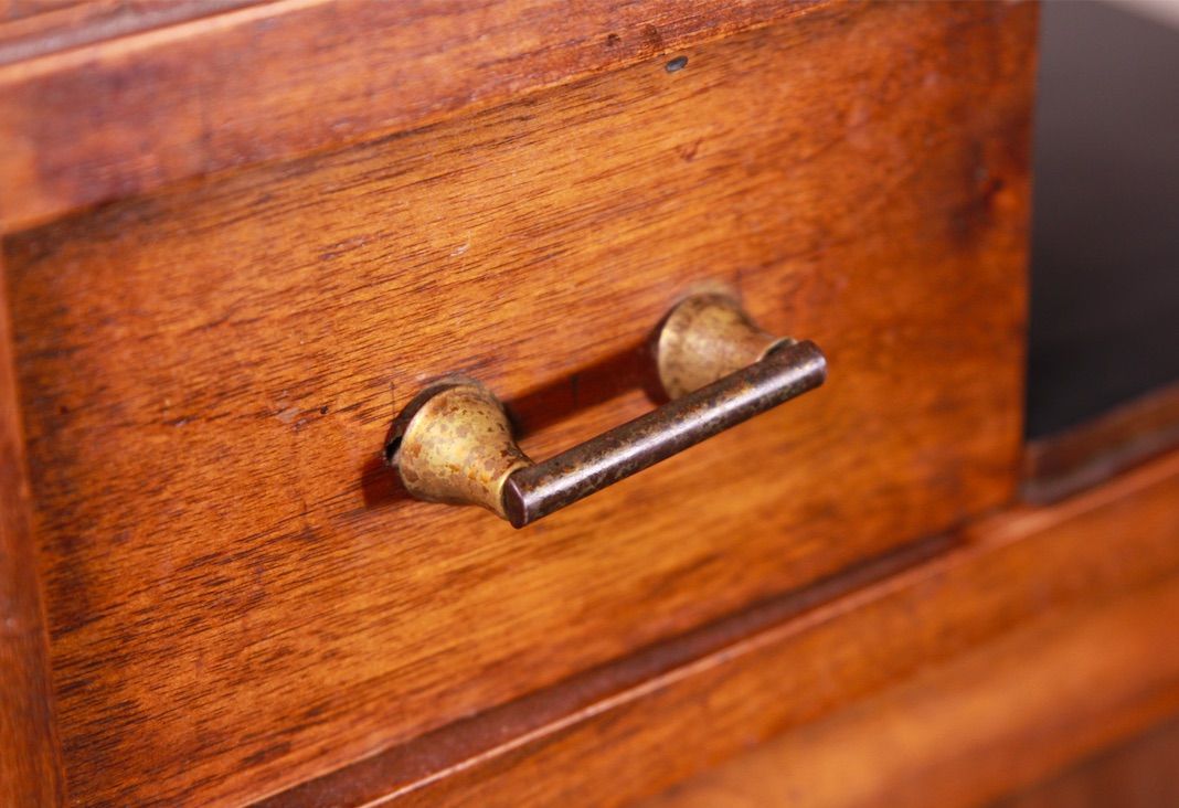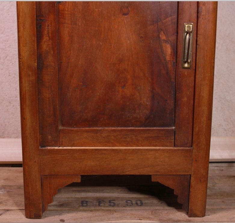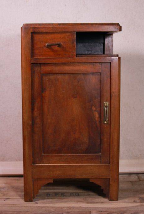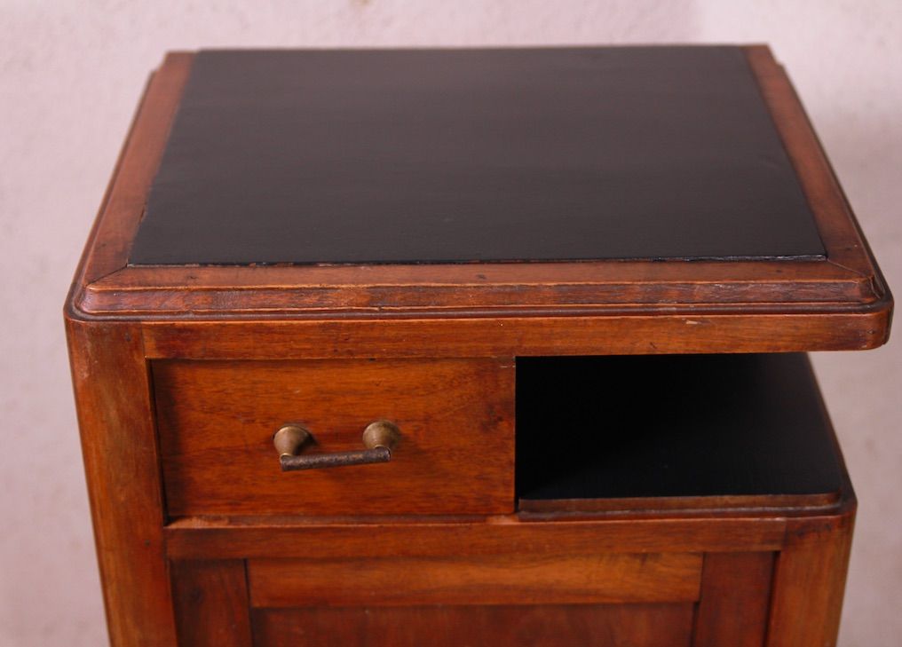 Ancienne et authentique avec ses ‘’défauts’’ de fabrication qu’il la rendent vivante. table d'appoint. Entièrement poncé, huilé et peint en noire (niche, plateau, tiroir).poignée authentique. Petit tiroir. Détail art déco sur les pieds avant. Vient d’une ferme limousine.