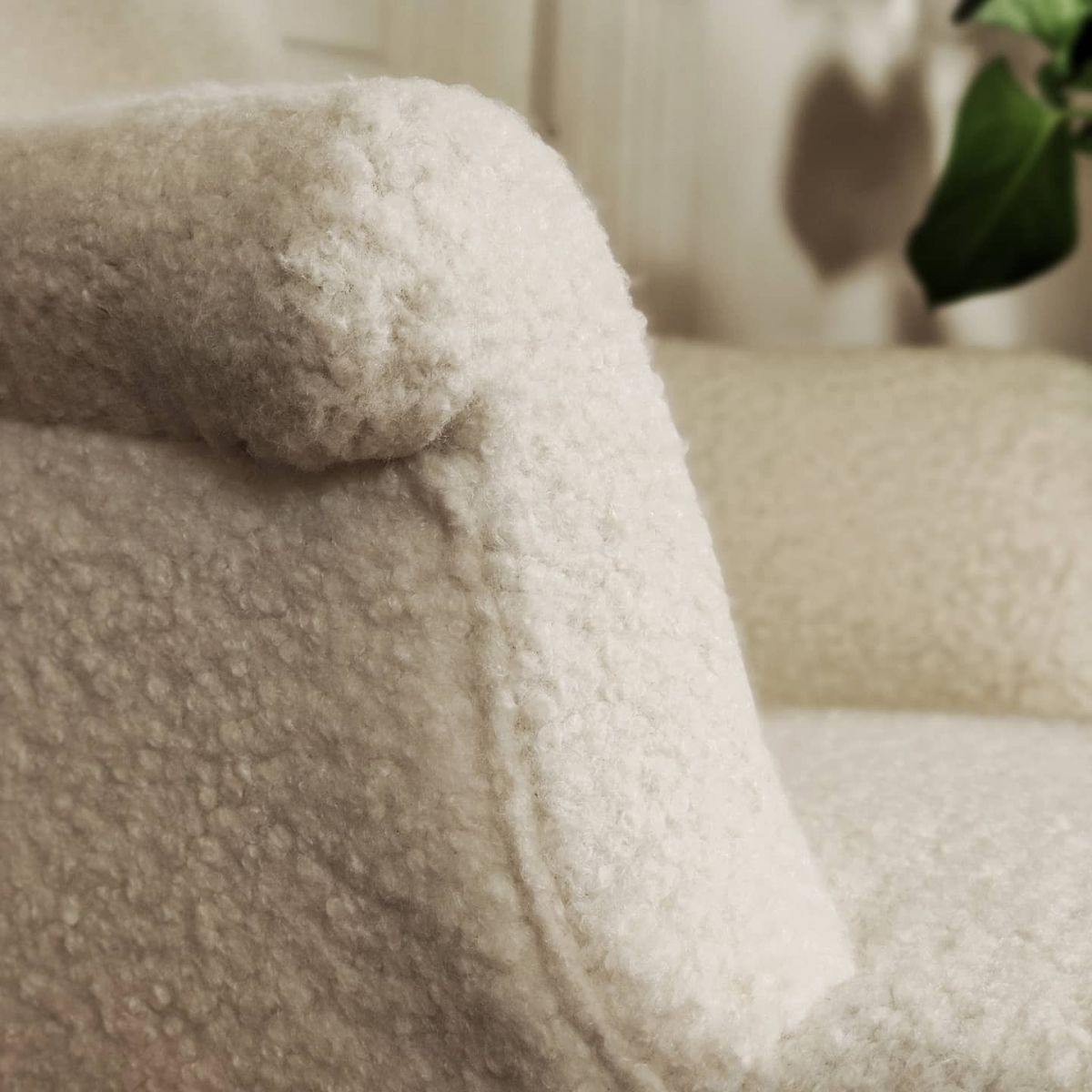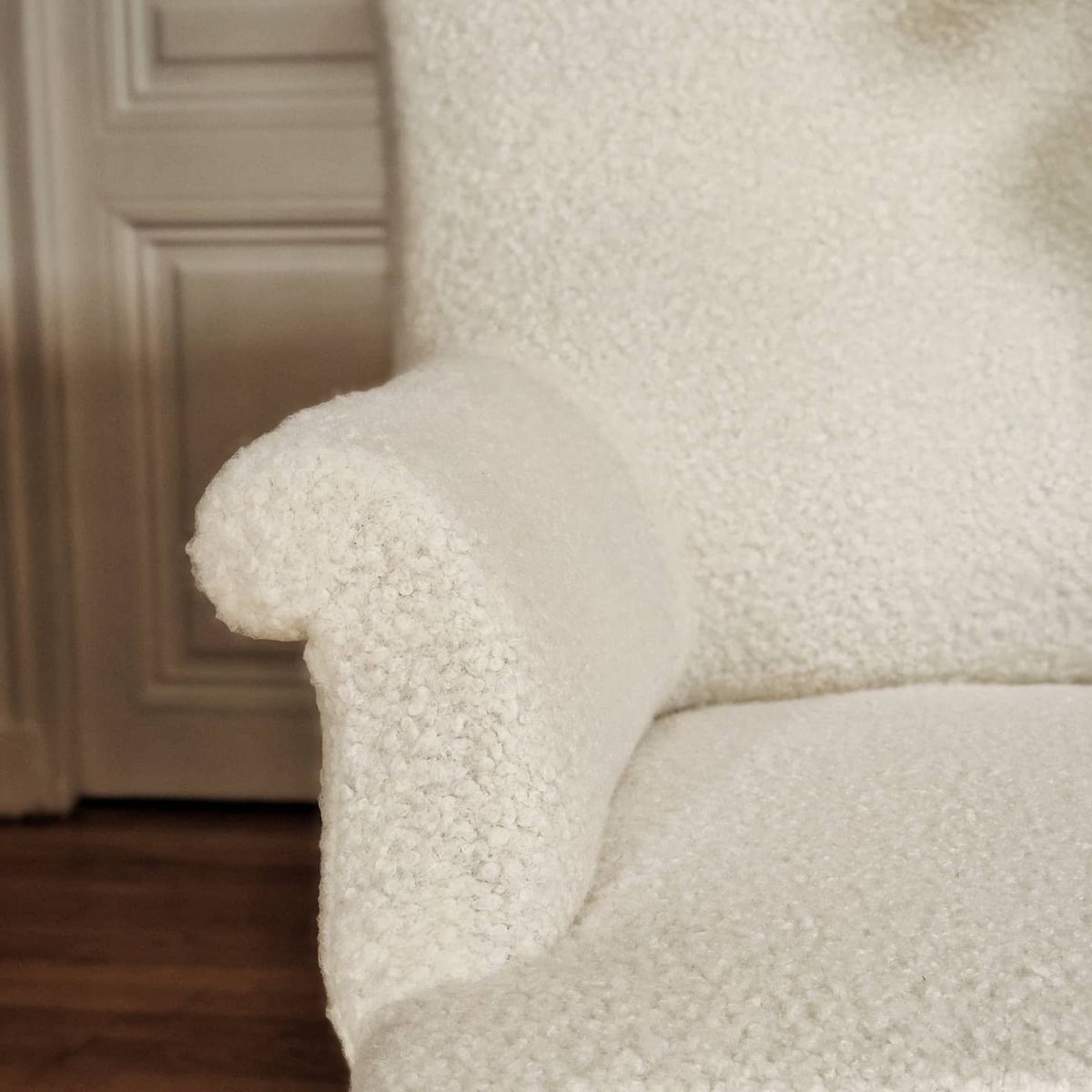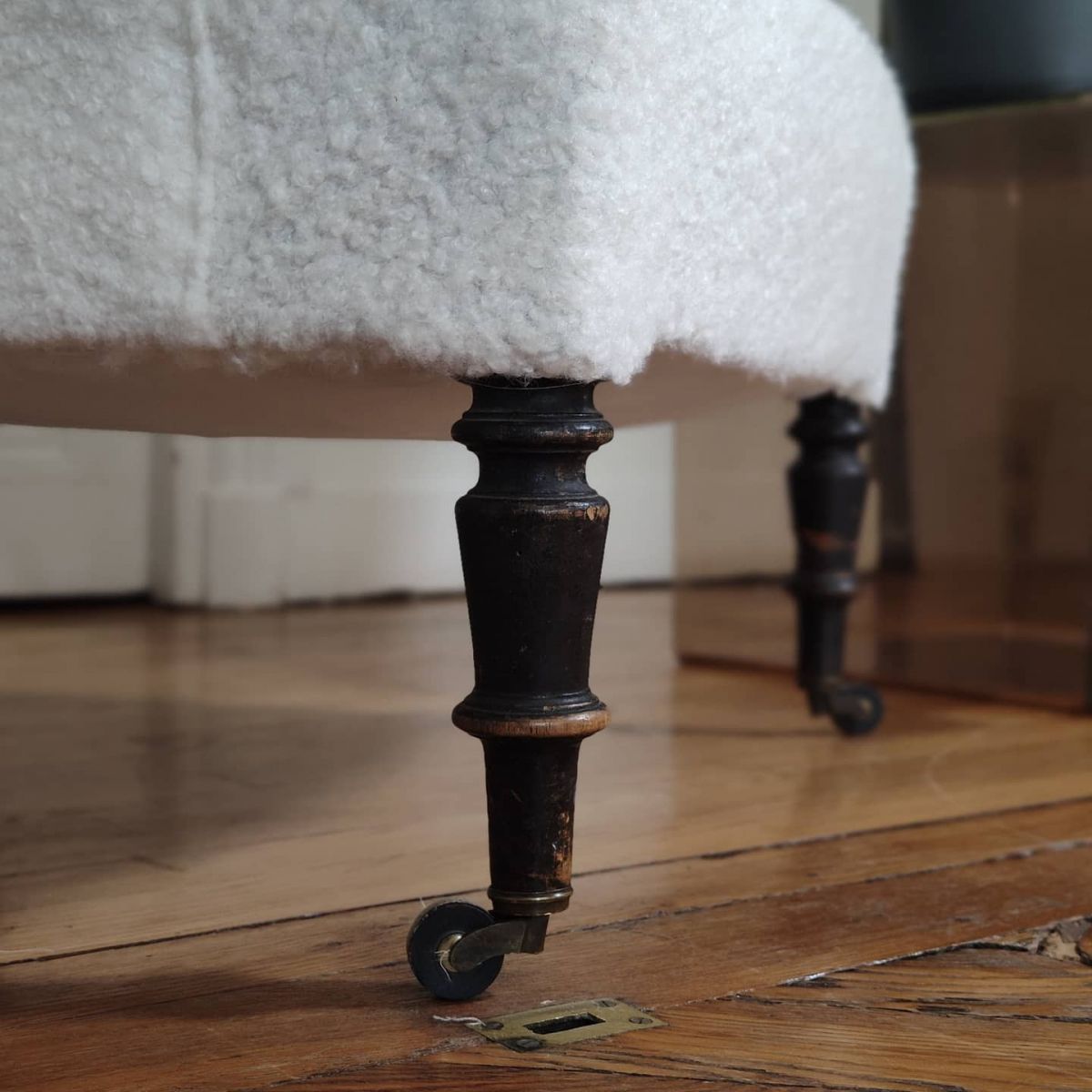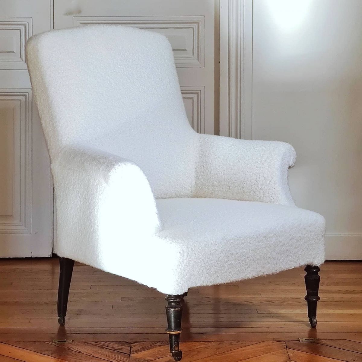 Très belle bergère ancienne qui a été rehoussé avec un tissu neuf, de la laine bouclée toute douce et tres tendance.
