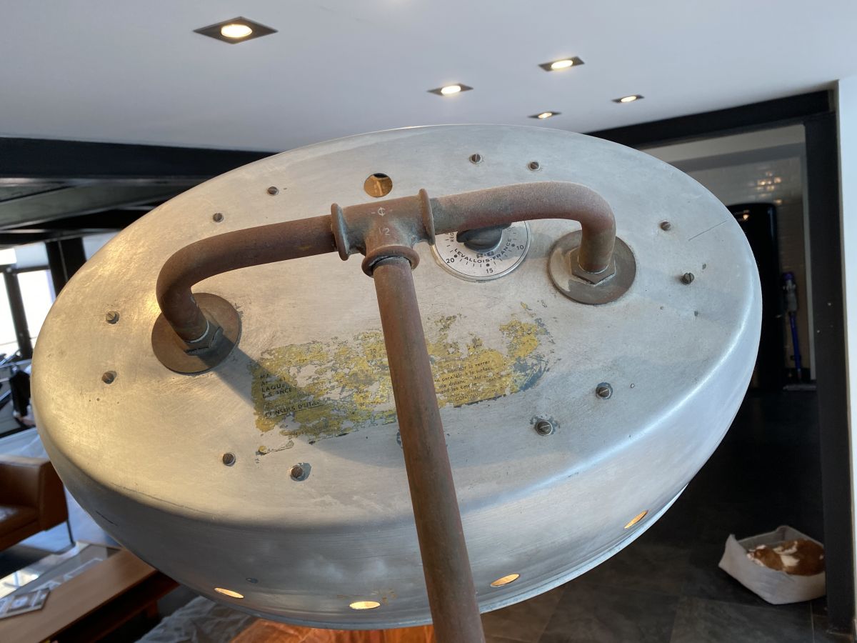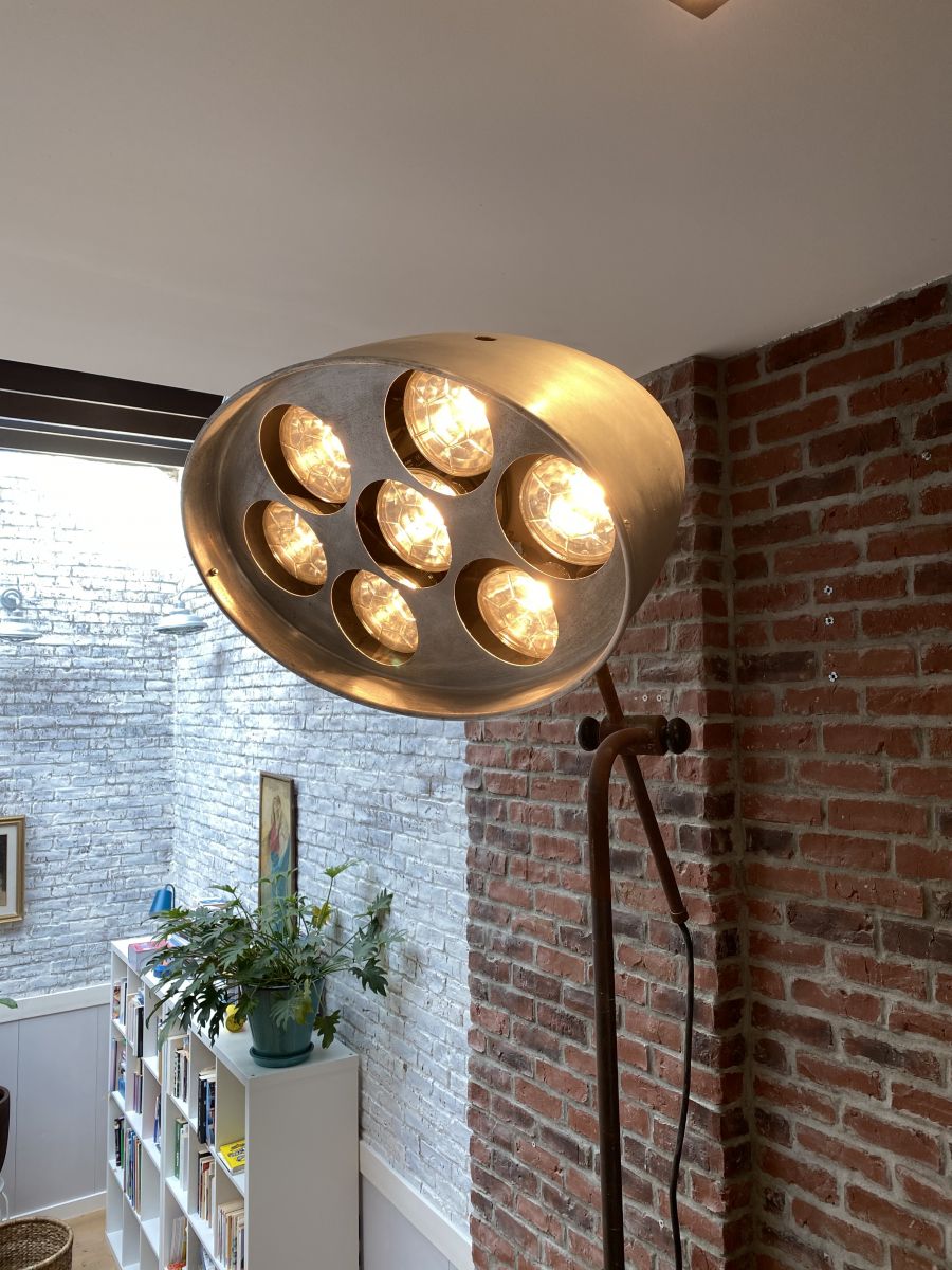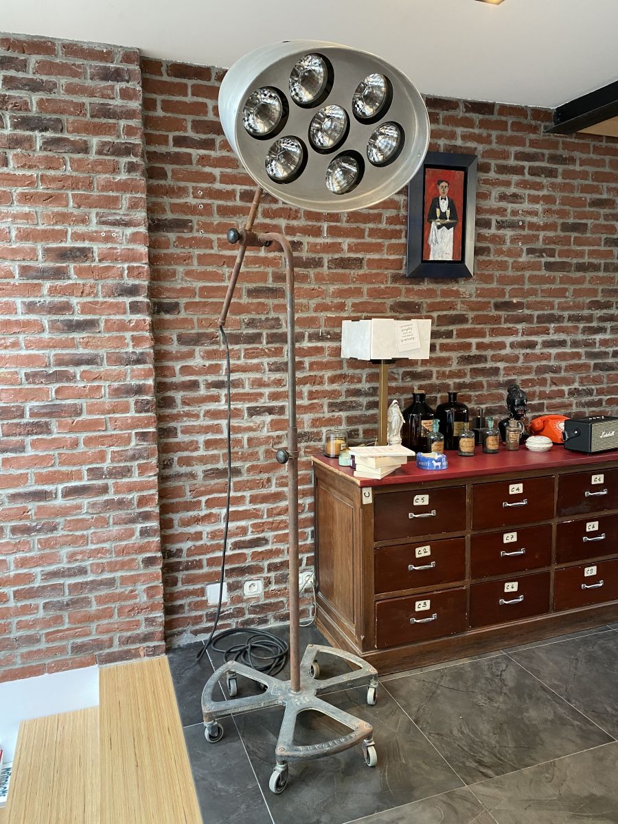 Superbe lampe d’atelier de la marque RG LEVALLOIS, utilisée dans les années 50 pour le séchage des peintures automobiles. Montée sur un pied en fonte équipé de roulettes (facilité de déplacement), elle est entièrement réglable (tête orientable/bras coulissant/hauteur variable). Dimensions : Hauteur maximum = 220 cm - diamètre du piétement = 63 cm - Réflecteur = 63 / 40 cm Equipement : Luminaire entièrement recâblé. Doté de 7 ampoules standard à douilles gros culot (7x60W MAZDA) Etat : Présence de traces du temps passé Référencé dans de nombreux ouvrages comme l’un des objets cultes du Mobilier Industriel.