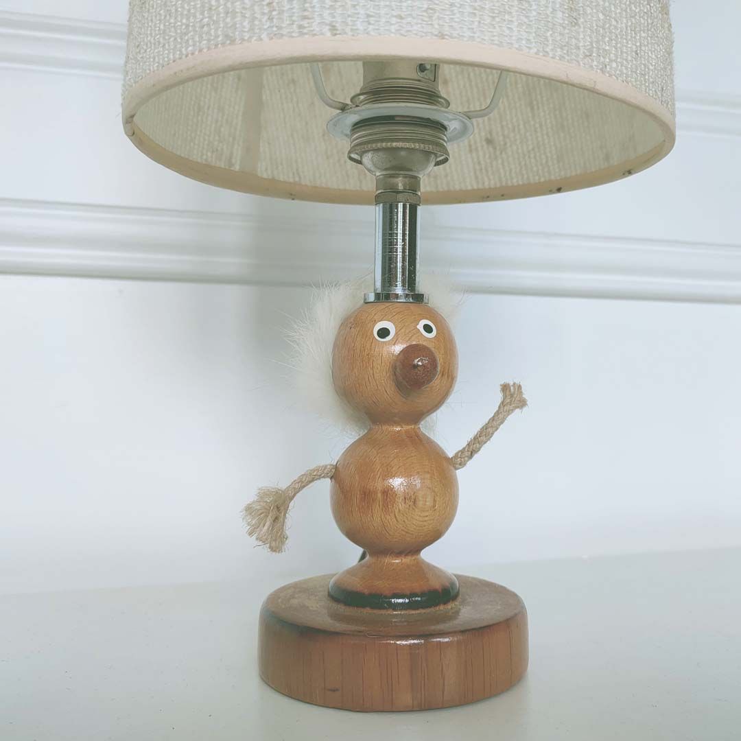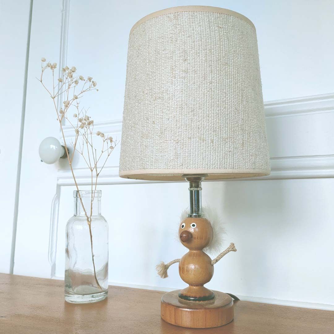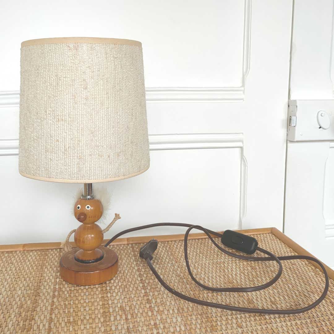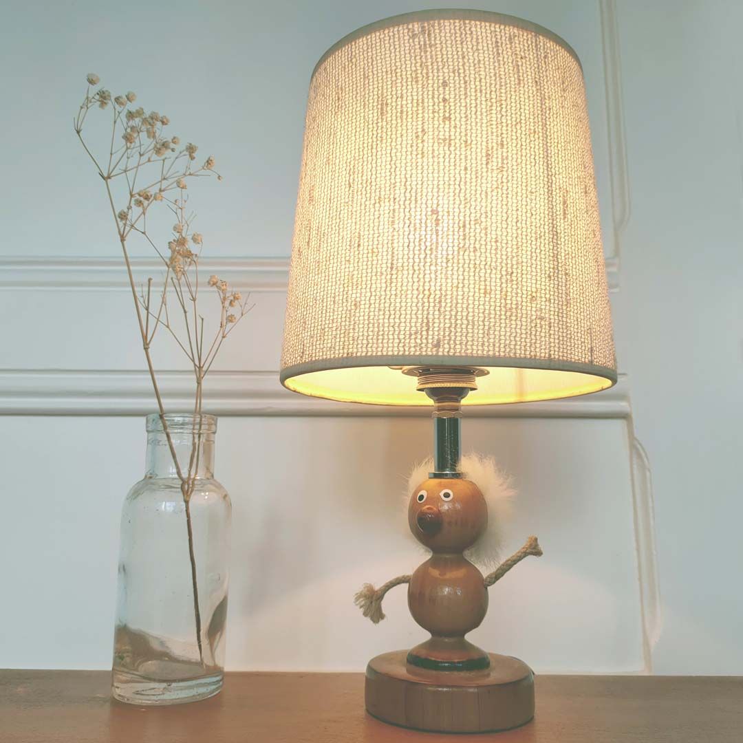 Jolie lampe vintage et atypique représentant un petit viking en bois, corde et chevelure en fourrure. Hauteur 31cm. Douille pour petite ampoule à baïonnette ( ampoule non fournie).