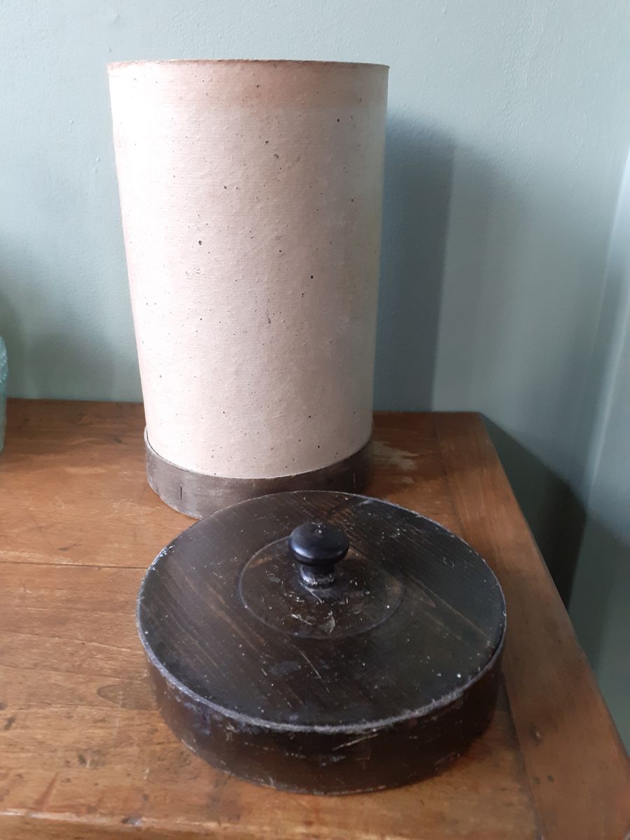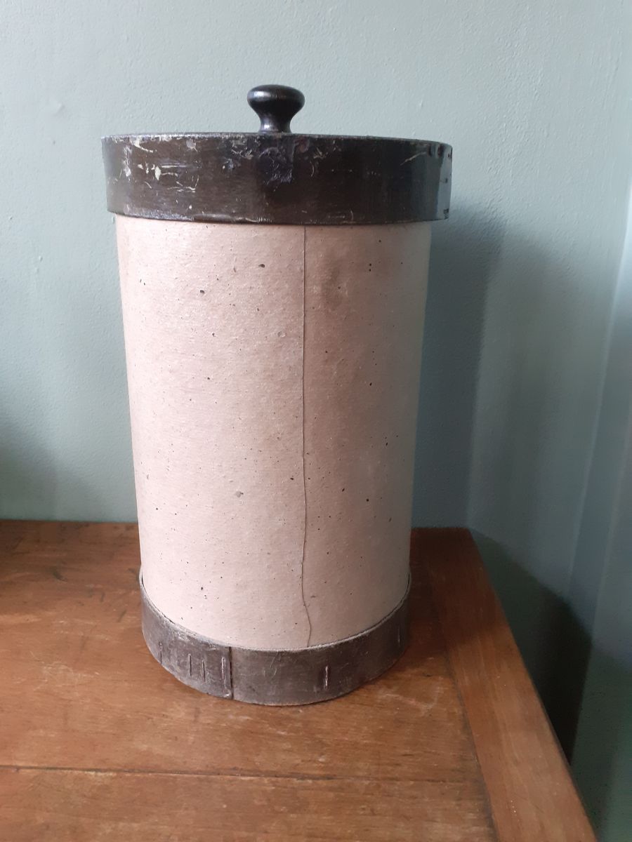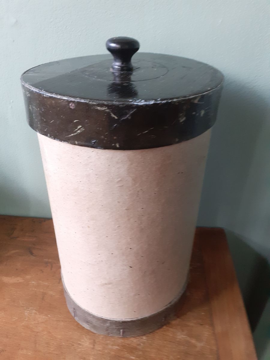 Pot d'herboriste des années 40/50 en bois (couvercle et fond) et carton bouilli. Il est de couleur mastic et marron pour le cerclage et le couvercle.