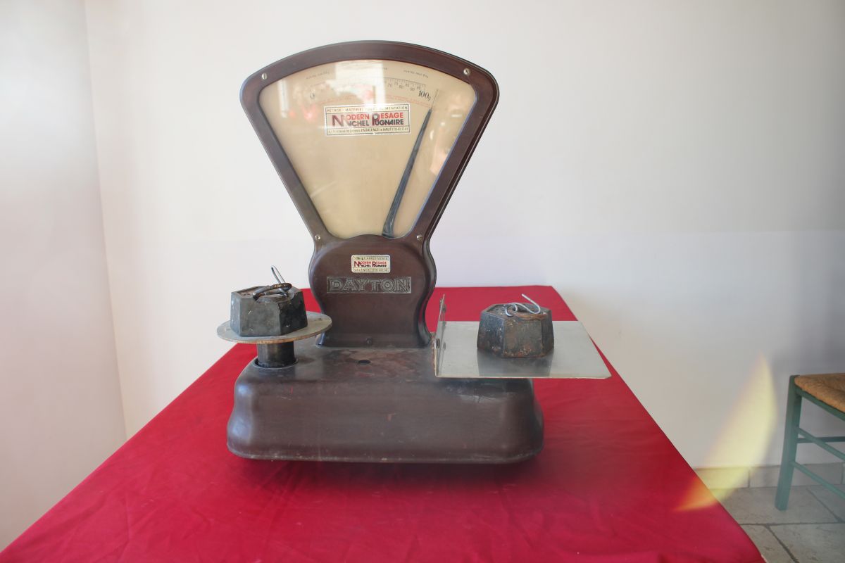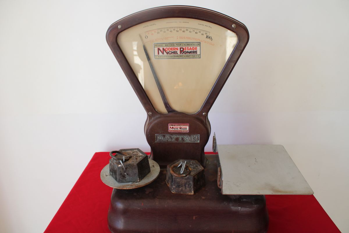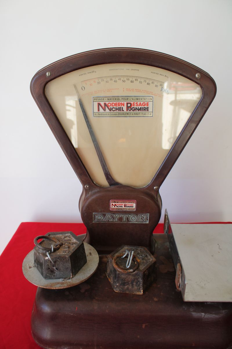 En bakélite. Inscription " pesage, matériel pour l'alimentation, moderne pesage, Michel Pugnaire, 4 rue F. De Lesseps, ZA Valence, (75) 43 17 41.