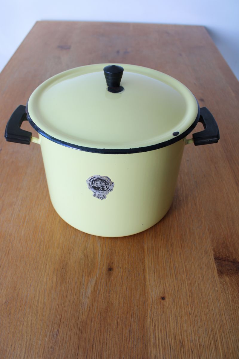 Logo de la marque "Aubecq" visible sur le devant. Aubecq, marque de faitouts et casseroles émaillés fondée dans la nord en 1917.