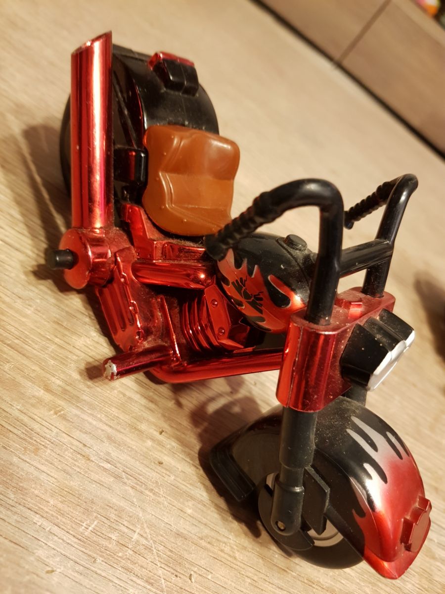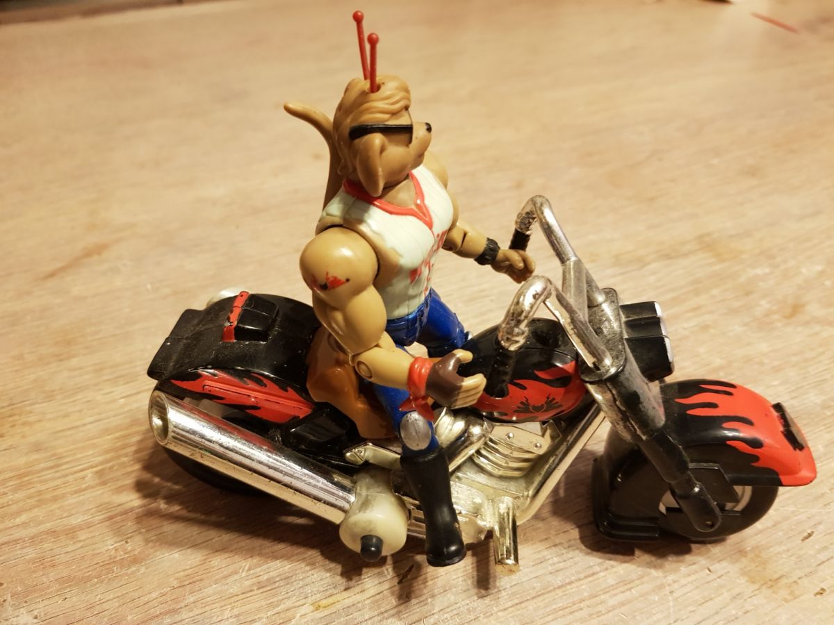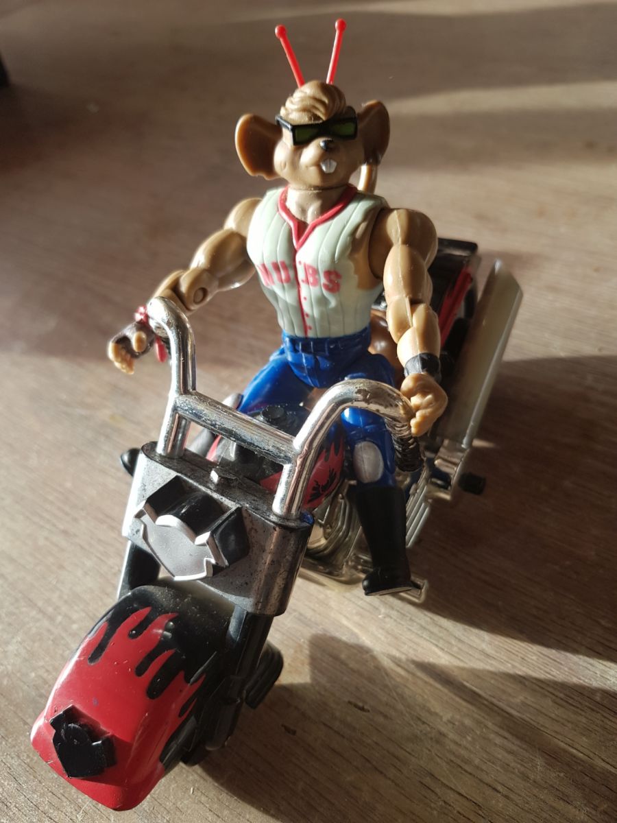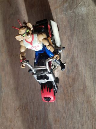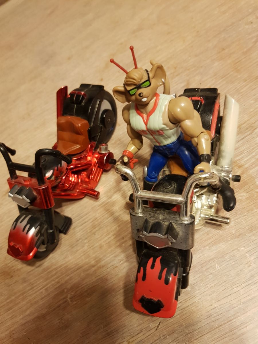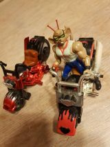 1 Figurine les souris de l'espace avec 2 motos. C'est un jouet d'occasion , la peinture chromée est effacée sur le pot d'échappement d'une des motos , et il doit manquer un pot d'echappement, sinon bon état général.