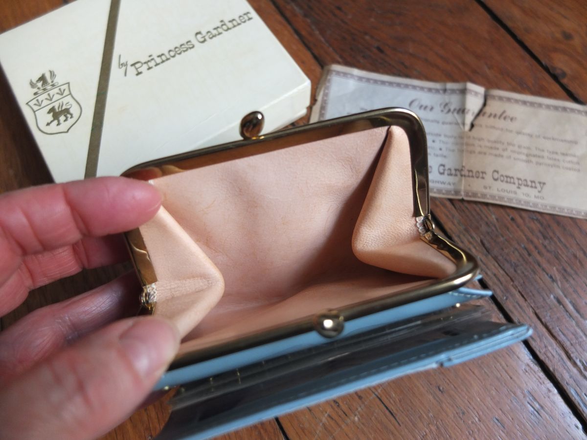 porte-feuille bleu glacier en cuir, neuf, vintage