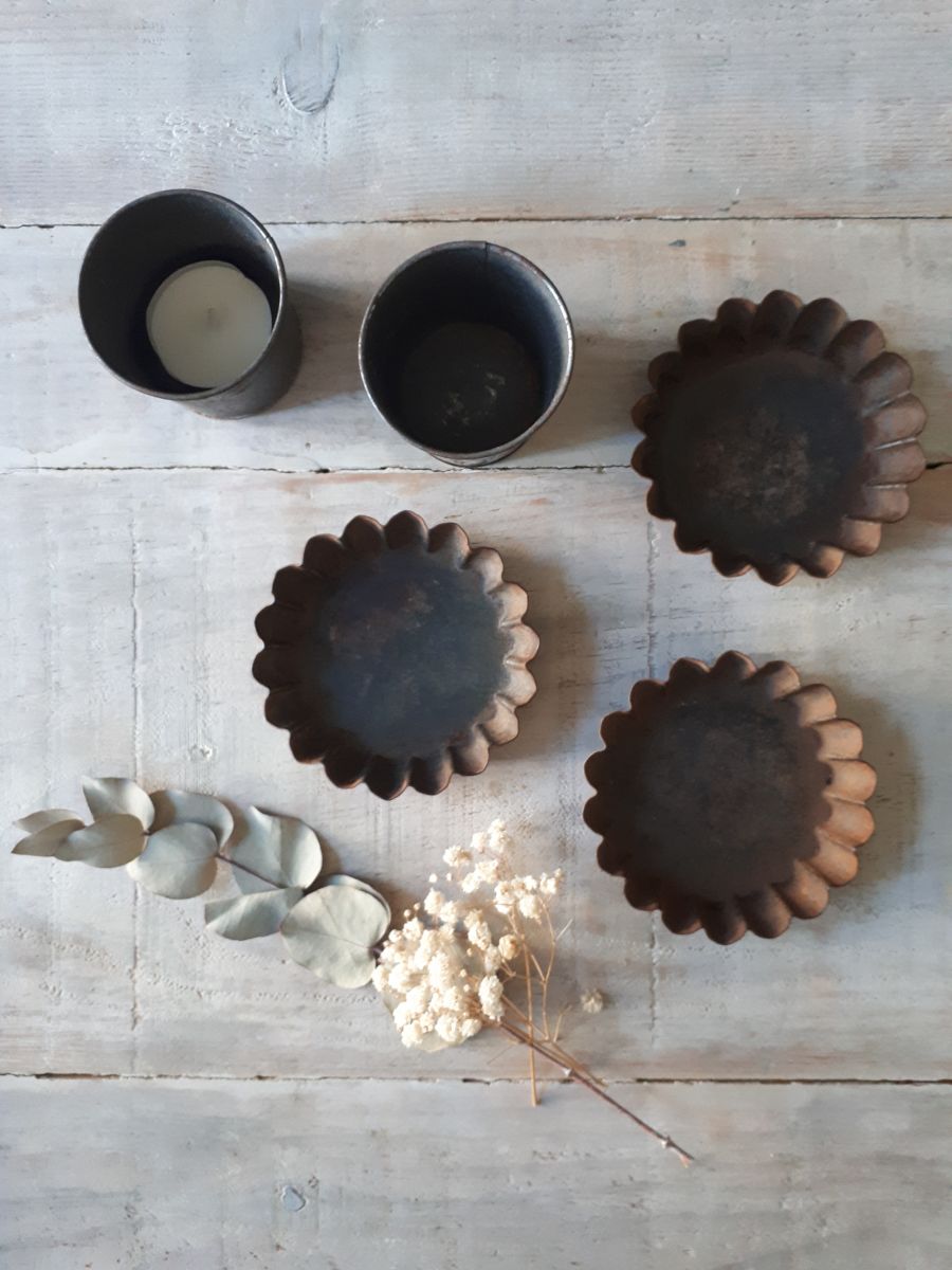 Lot de 2 gobelets et 3 petits moules à tartelettes en metal rouillé (pour déco). On peut glisser une bougie dans les gobelets.