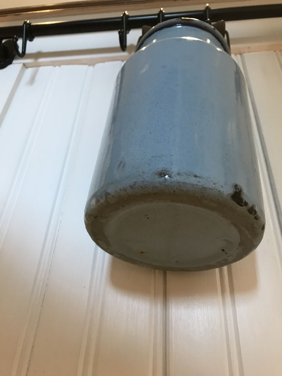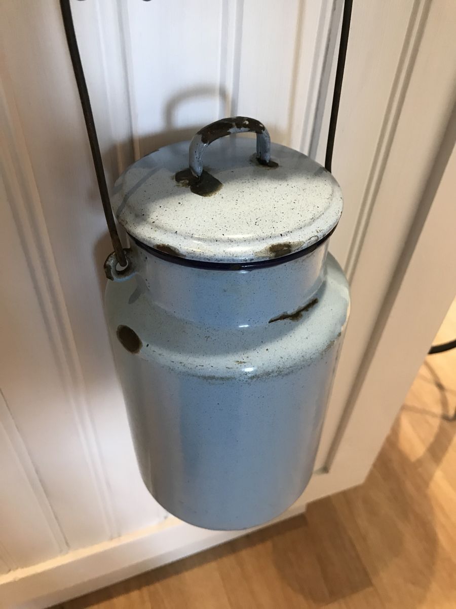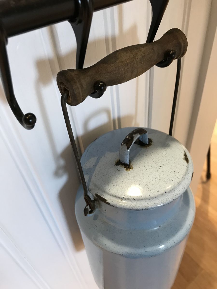 Joli pot à lait en tôle émaillé de couleur bleu ciel.