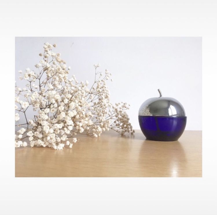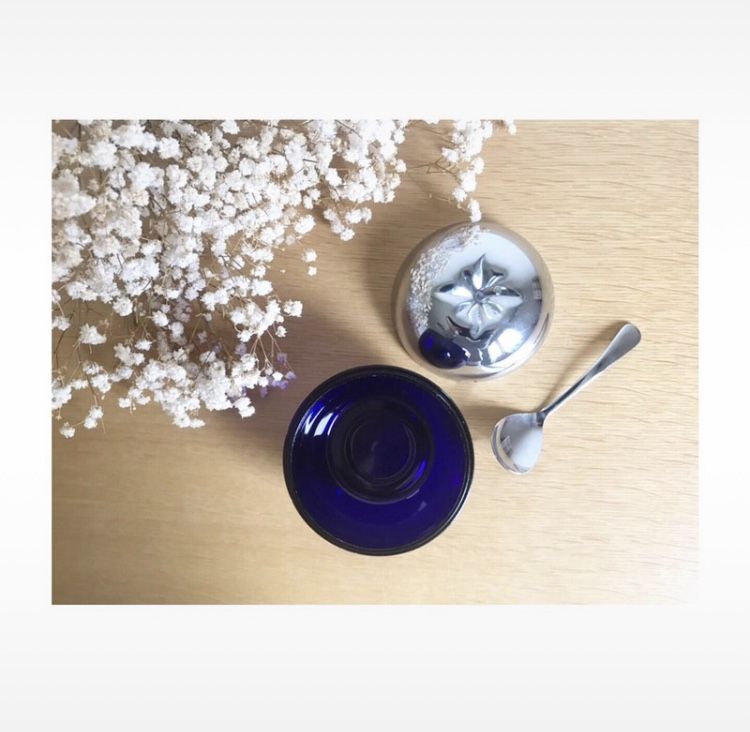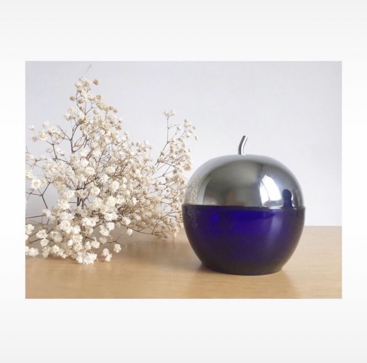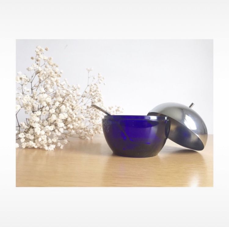 Un joli sucrier en verre bleu roi surmonté d’un couvercle en métal argenté.