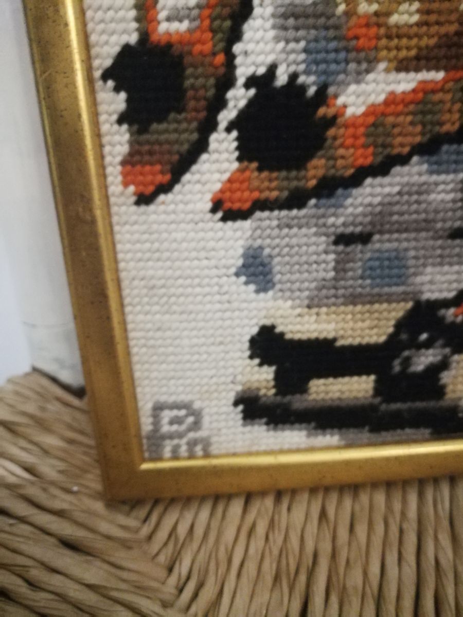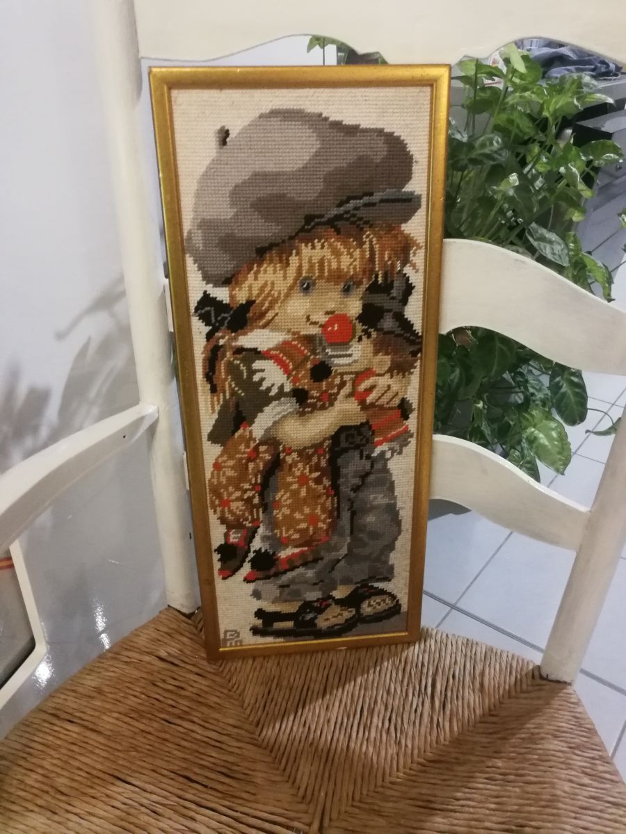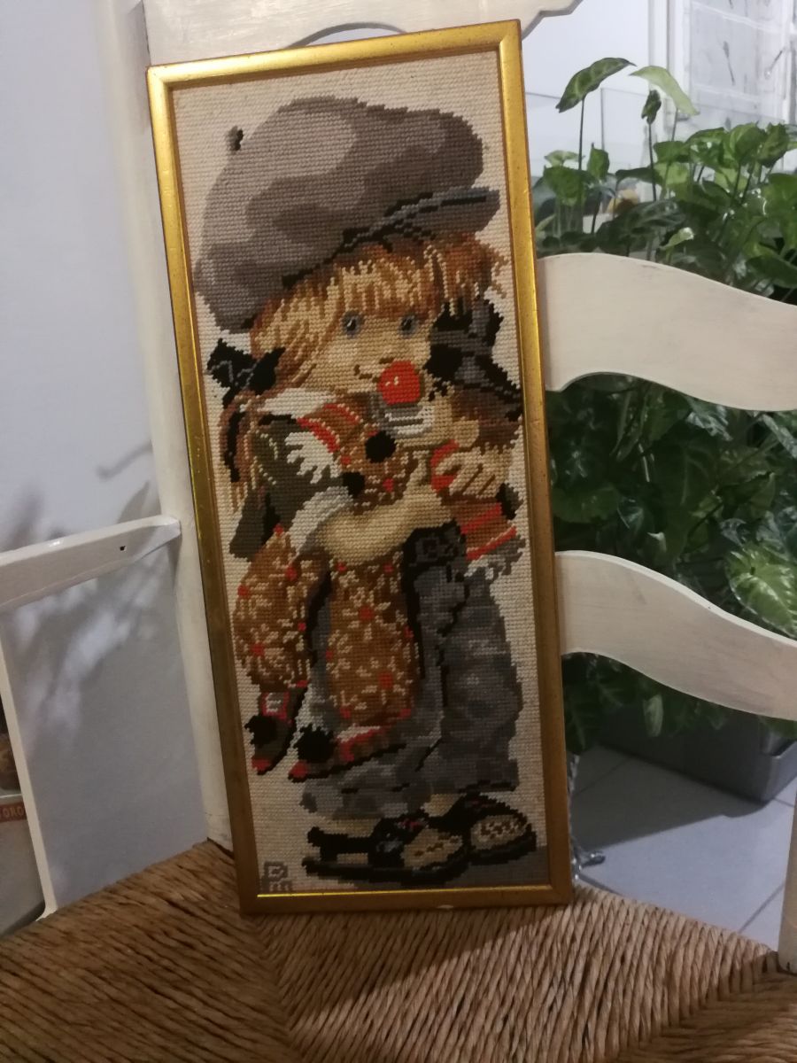 Canevas d'un petit garçon tenant son doudou dans ses bras, Vintage et sympa pour une chambre d'enfant.il y a quelque traces d'usures sur le cadre.
