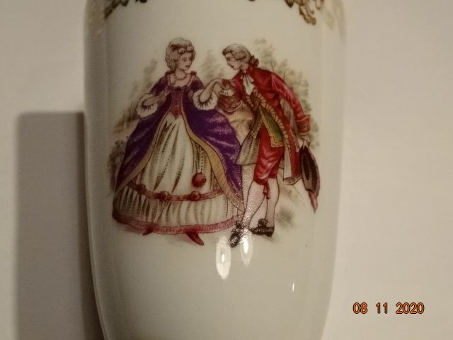 2 très beaux mazagrans en porcelaine de luxe, France, décorés sur le bord d'un dessin or très finement ciselé et d'une scène galante où l'on voit un marquis courtisant une marquise. En parfait état.