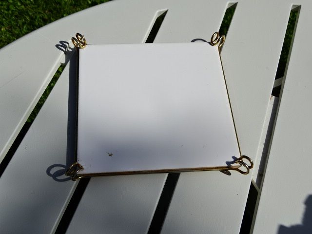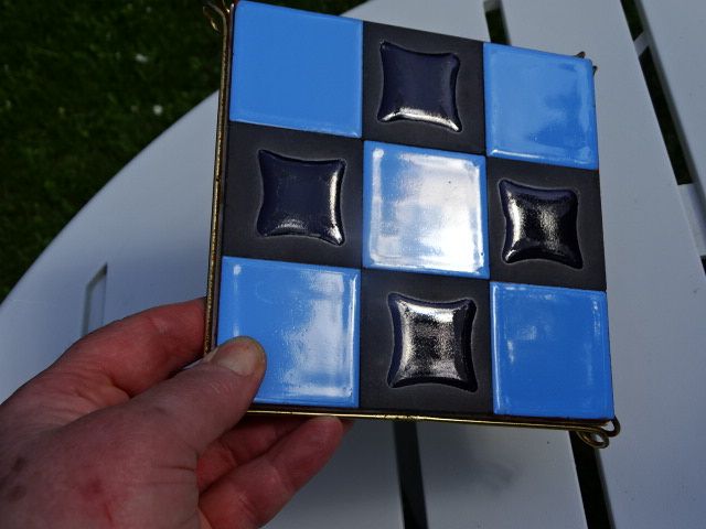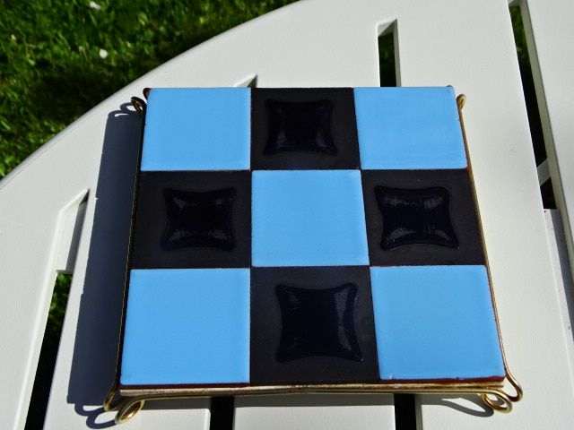 Beau dessous de plat des années 50/60, composé d'un carrelage quadrillé de carreaux noirs mat surmontés d'un quadrilatère noir brillant (portant quelques traces d'usage) et de carreaux bleu clair, le tout cerclé de métal doré.