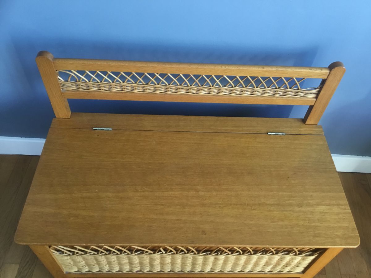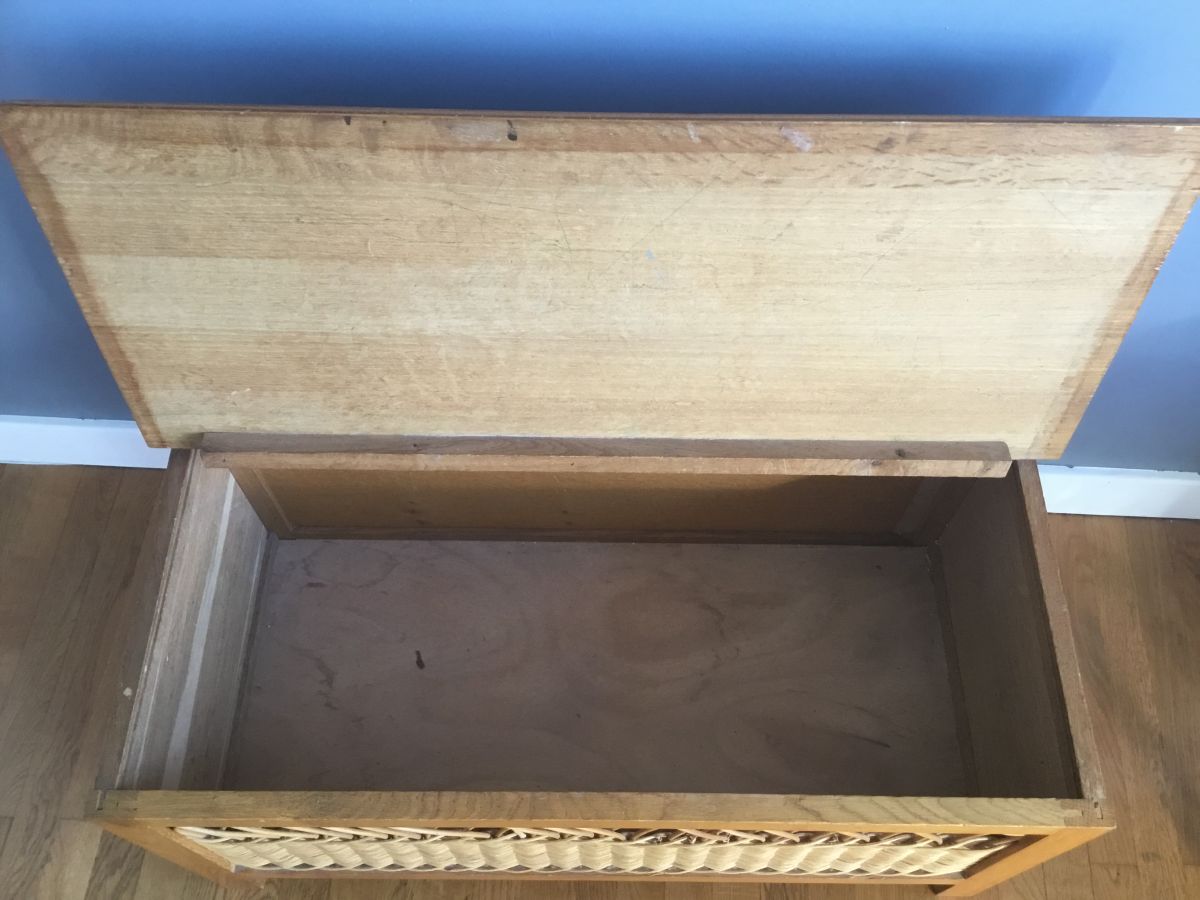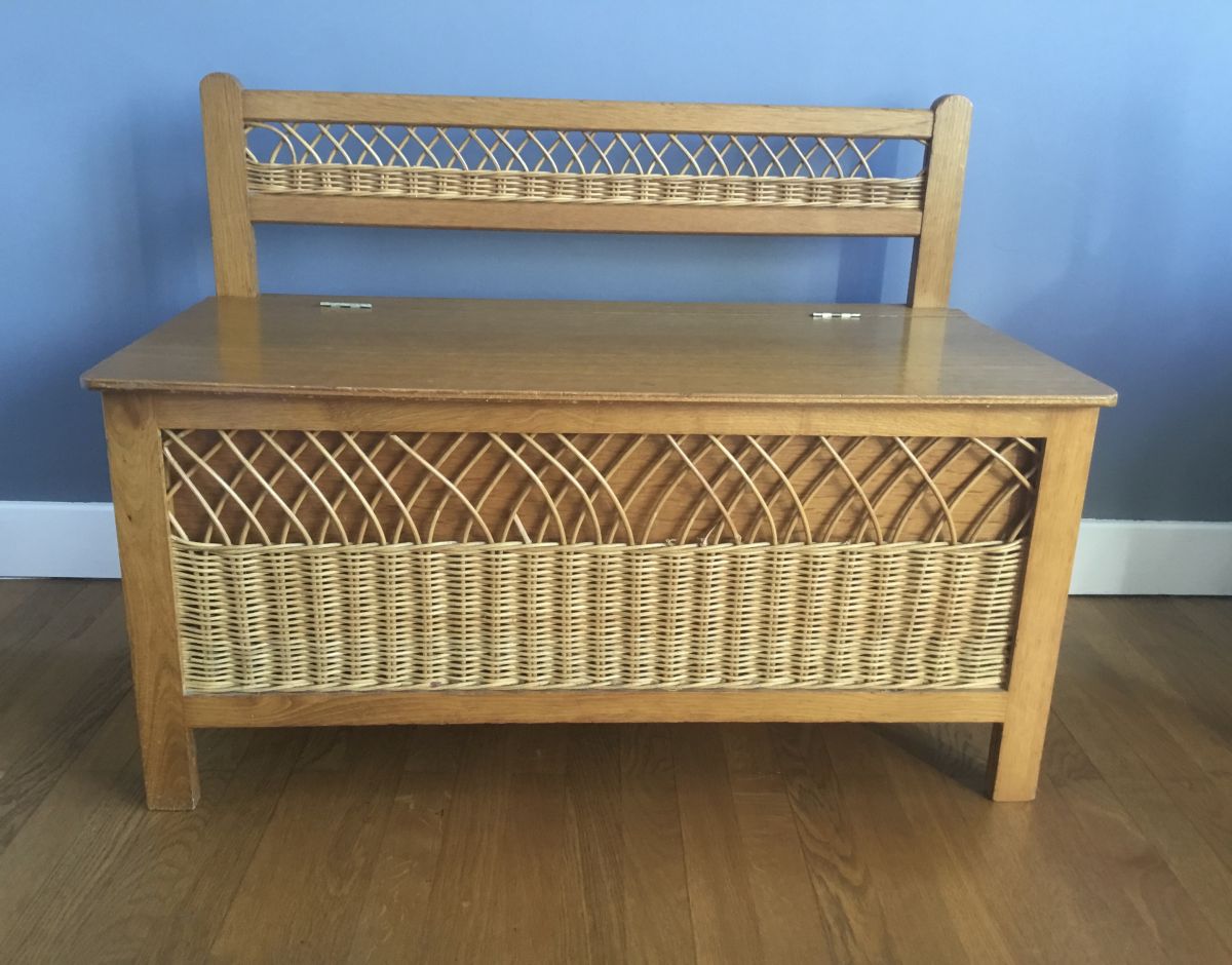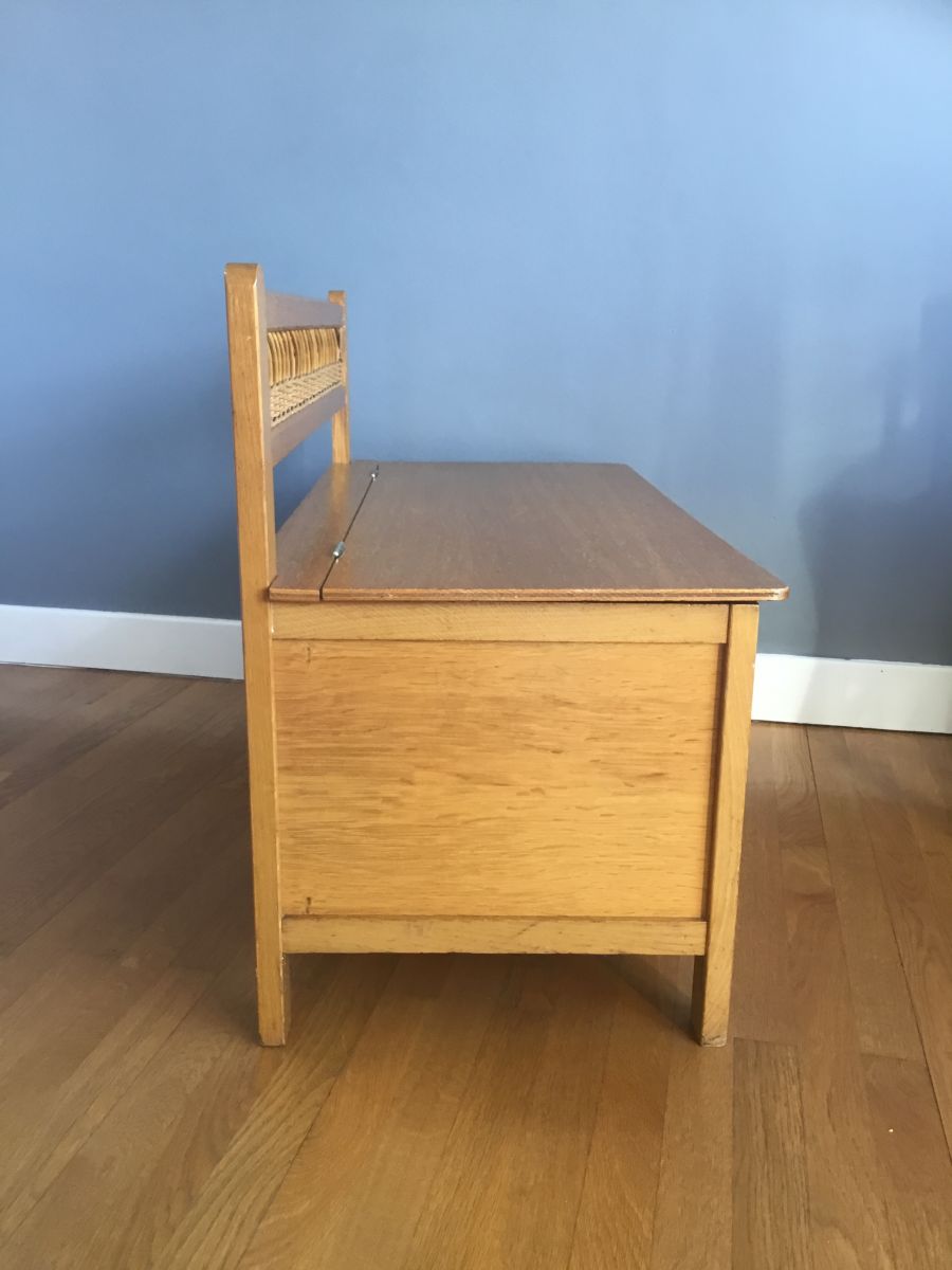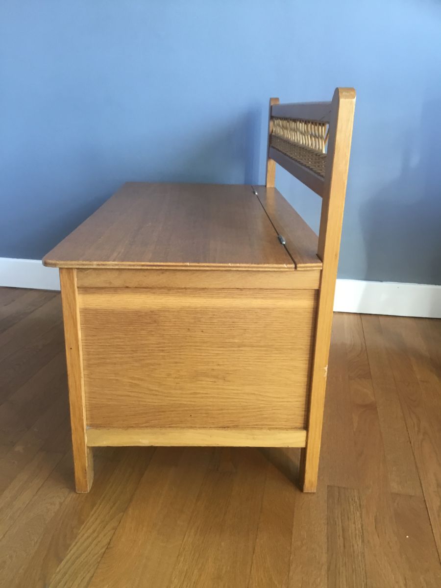 Joli petit banc coffre à jouet en chêne et placage de chêne typique des années 50/60. Avec son petit fronton en osier et son ornement en osier sur la façade du caisson il est en très bon état malgré son âge et ses manque osier. Quelques traces du passé mais rien de grave. Largeur 80 cm, profondeur 42 cm, hauteur 60 cm.