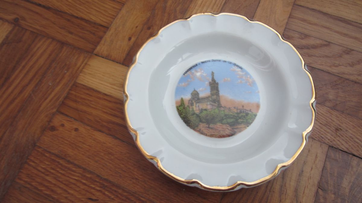 En porcelaine Goumot-Labesse, cette petite assiette décorative est à l'effigie de Notre-Dame-de-la-Garde à Marseille.