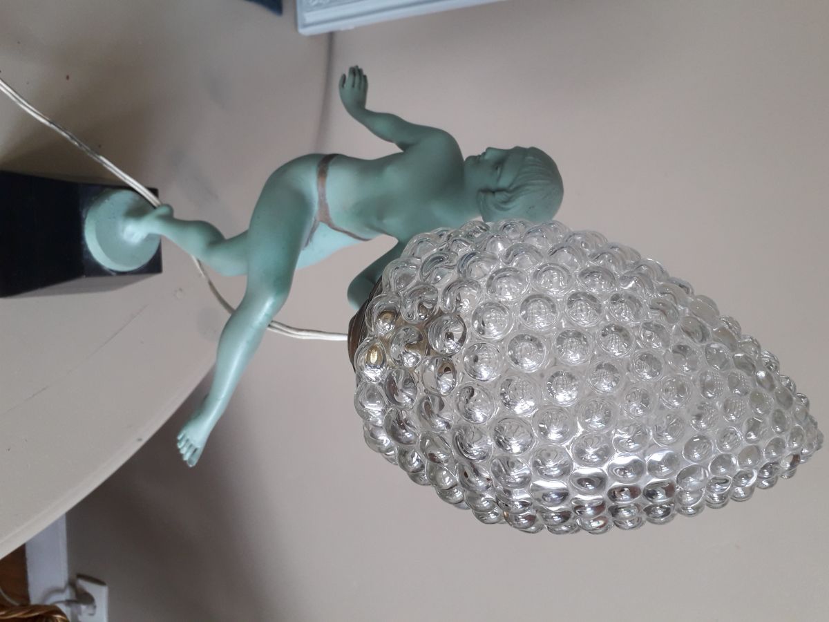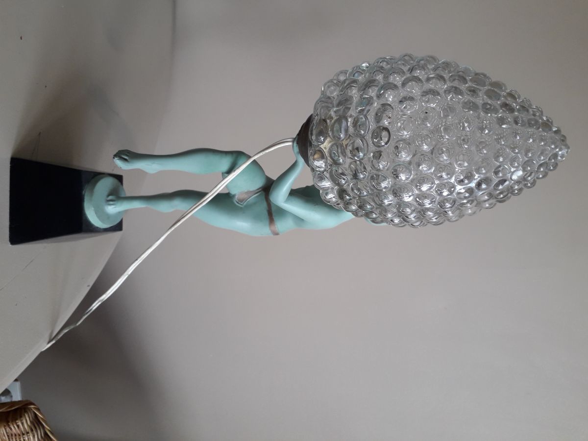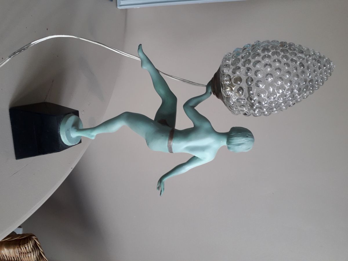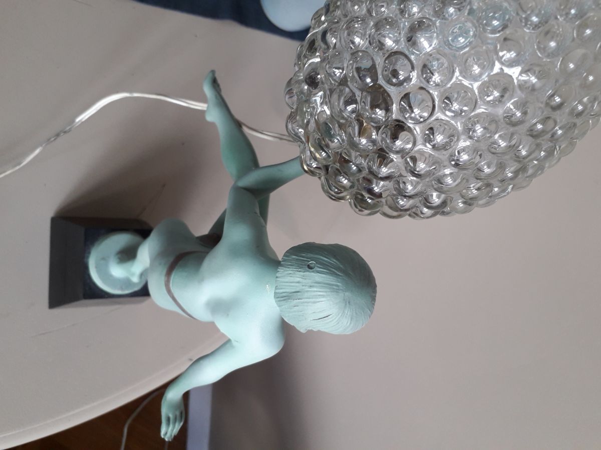Lampe art-déco des années 20 représentant une danseuse de couleur vert de gris montée sur un socle noir tenant dans sa main un luminaire en verre bullé. L'appareillage électrique fonctionne parfaitement.